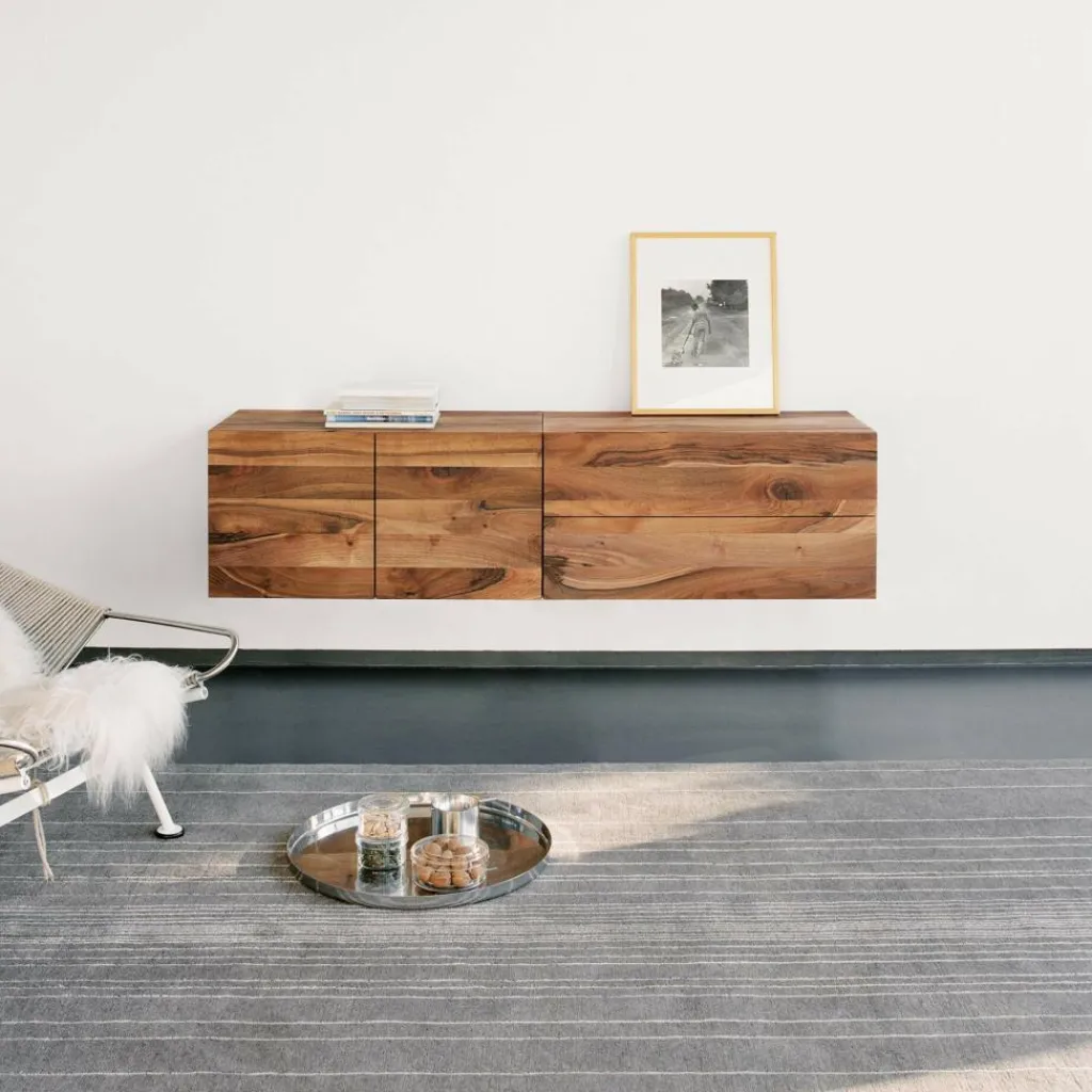 Gefertigt aus massivem Nussbaumholz, besticht der Shahnaz Wandschrank durch seine minimalistische Eleganz. Die markante Holzmaserung verleiht jedem Exemplar eine individuelle Note und setzt natürliche Akzente. Mit seiner rechteckigen Form fügt es sich nahtlos in unterschiedlichste Wohnstile ein und bietet eine stilvolle Ablagefläche für Bücher, Dekorationsobjekte und persönliche Gegenstände. Hinter den beiden quadratischen Türen des Sideboards verbirgt sich jeweils ein großzügiges Fach mit einem Zwischenboden, hier finden Dokumente, technische Geräte oder Alltagsutensilien ihren Platz. Durch das clevere Design ohne sichtbare Halterungen scheint der Shahnaz Wandschrank nahezu an der Wand zu schweben, während die präzise gearbeiteten Kanten und feinen Details die hohe Verarbeitungsqualität betonen. Eingelassene Aluminiumleiste sorgen für die nötige Stabilität. Die Türen sind beidseitig montierbar. Mit seinen Maßen von 90 cm Breite, 45 cm Tiefe und 45 cm Höhe überzeugt der Shahnaz Wandschrank mit einer perfekten Balance aus Ästhetik und Funktionalität. Zur Pflege der gewachsten Oberfläche wir ein passendendes Pflegeset mitgeliefert.