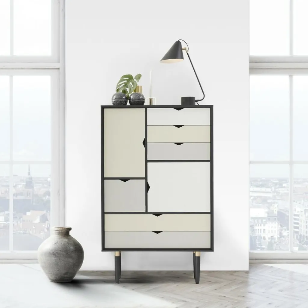 Die Fronten der einzelnen Schubladenelemente und der Türen bestehen aus Laminat und sind in unterschiedlichen, hellen Farben gehalten. Je nach Ausführung kommen die mit Messingringen versehenen Beine und der Korpus schwarz lackiert oder im natürlichen Holzton Eiche daher. Sie können die Andersen Furniture S5 Kommode Fronten bunt ideal mit den Sideboards und anderen Kommoden aus der beliebten Produktserie kombinieren. Die lebendig wirkenden Möbelstücke von Andersen Furniture sind auch mit komplett weißen Fronten erhältlich.