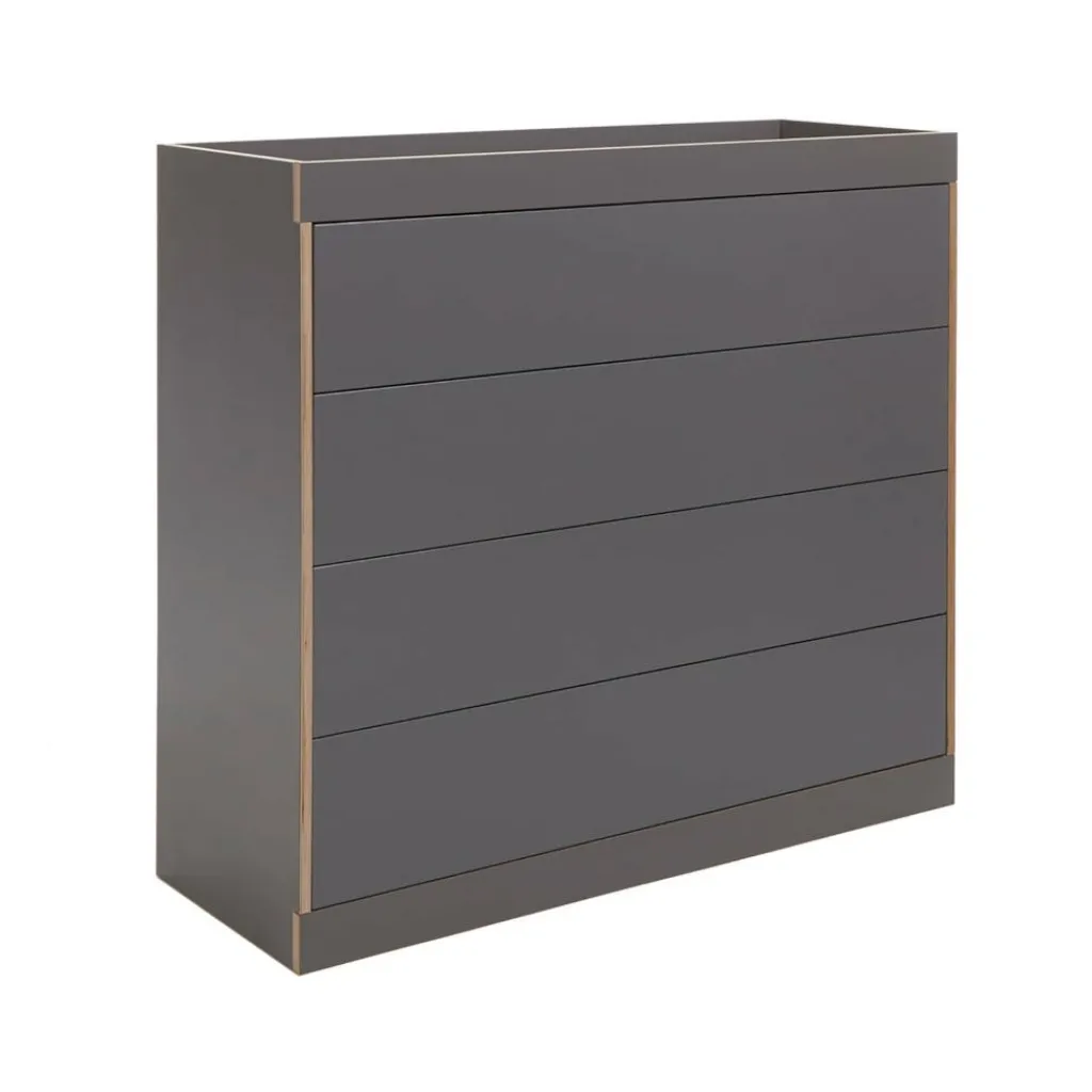 Die Flai Kommode mit Schubkästen ist mit vier Schubladen ausgestattet. Sie hat eine Breite von 118cm. Sie ist 108cm hoch und 45cm tief. Ihr Gewicht beträgt 120kg. Das Designstück ist in verschiedenfarbigen Ausführungen erhältlich. Als Zubehör gibt es einen praktischen Haken, der zum Aufhängen von Kleidern über die Kante der Kommode gesteckt wird.