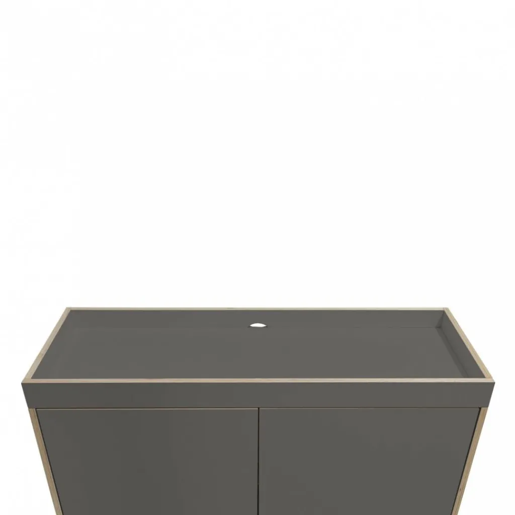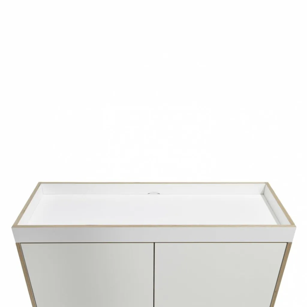 Die Flai Kommode wurde vom Designstudio kaschkasch für den Hersteller Müller Small Living entworfen. Das Design ist schlicht und funktional. Ein Kernelement der Möbel des Herstellers sind die offen liegenden Kanten des Schichtholzes auf der Vorderseite der Kommode. Das Besondere an diesem Modell ist die obere Platte. Diese ist nicht flach wie bei herkömmlichen Kommoden, sondern ist mit einem Rahmen versehen. Den umrahmten Bereich können Sie optional mit zusätzlich erhältlichen Ablage-Elementen mit Wollfilz-Auskleidung ausrüsten.