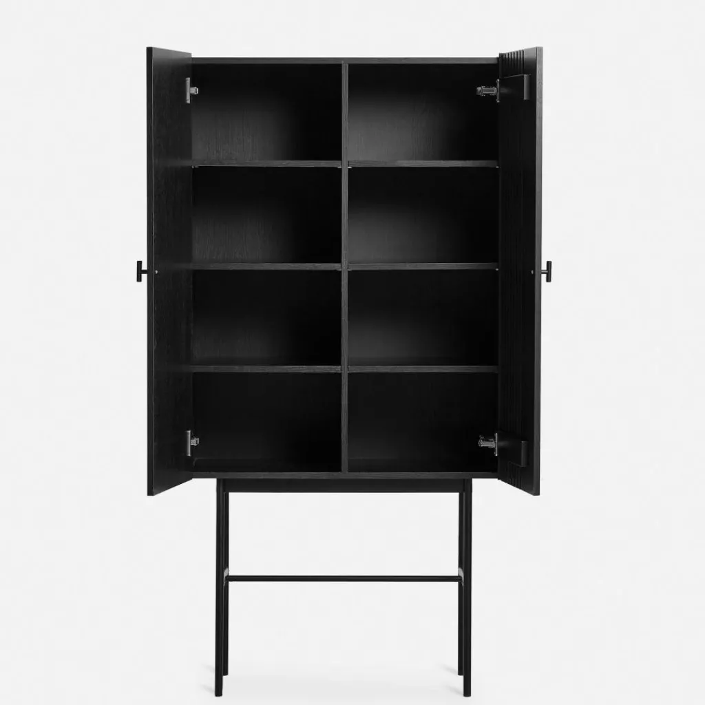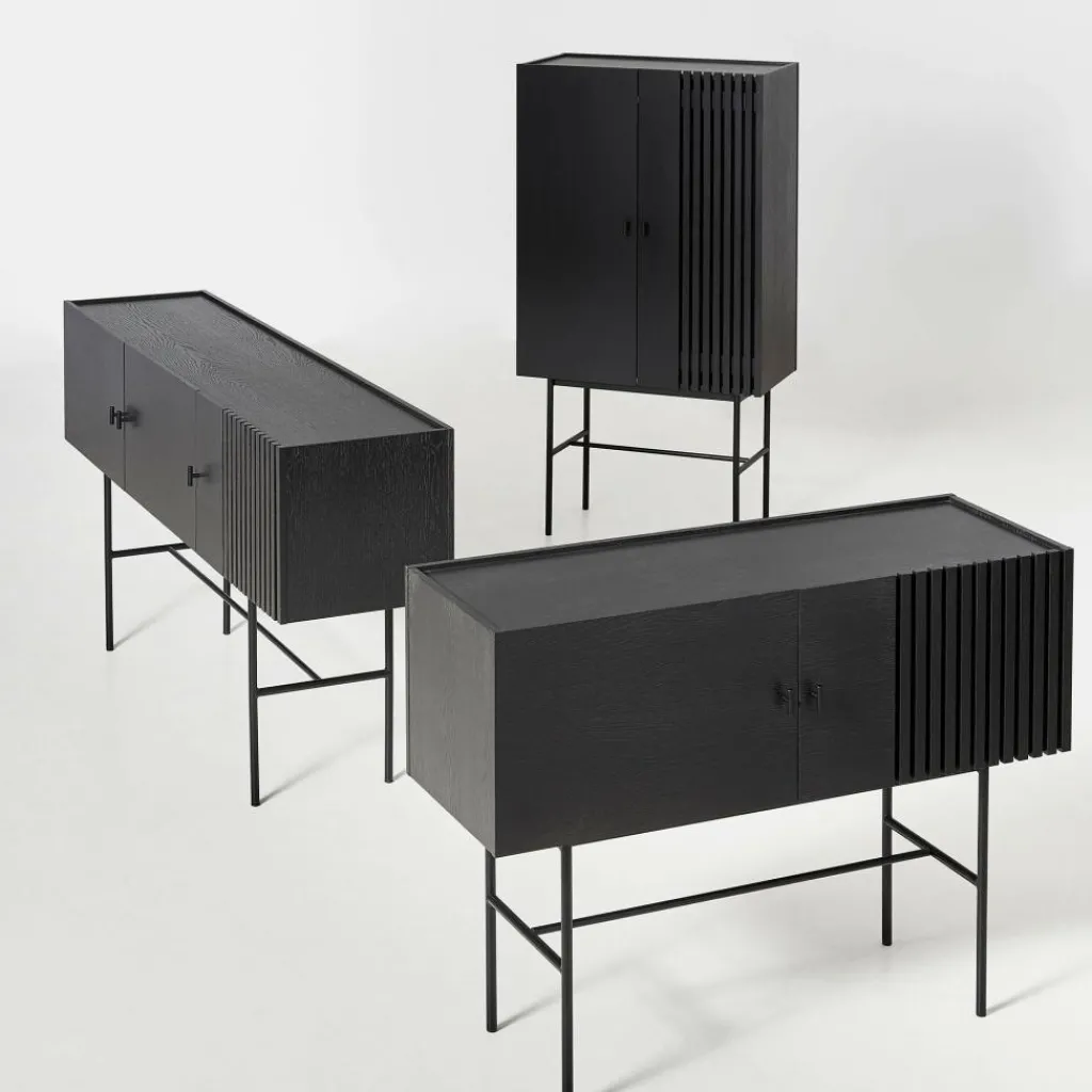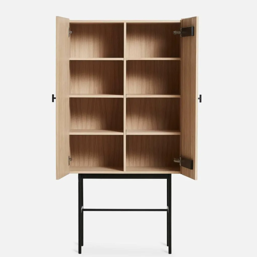 Inspiriert wurden die Designer von der modernen Architektur, die sich durch gerade Linien auszeichnet. Sie finden sich in der eleganten Front wieder, die an einer Seite feine Längsrillen zieren. In den Lamellen fangen sich Licht und Schatten und sie tragen zum stilvollen Gesamtbild bei. Hergestellt wird das Array Highboard 80cm aus Eichenfurnier und massivem Eichenholz, das aus Estland stammt. Die beiden Türen werden mit kleinen Griffen geöffnet und geschlossen. Einen interessanten Kontrast zum aus Naturmaterial hergestellten Korpus stellt das Gestell aus Eisen dar. Das Gestell besteht aus vier senkrechten Füßen, Querstreben sorgen für zusätzliche Stabilität.