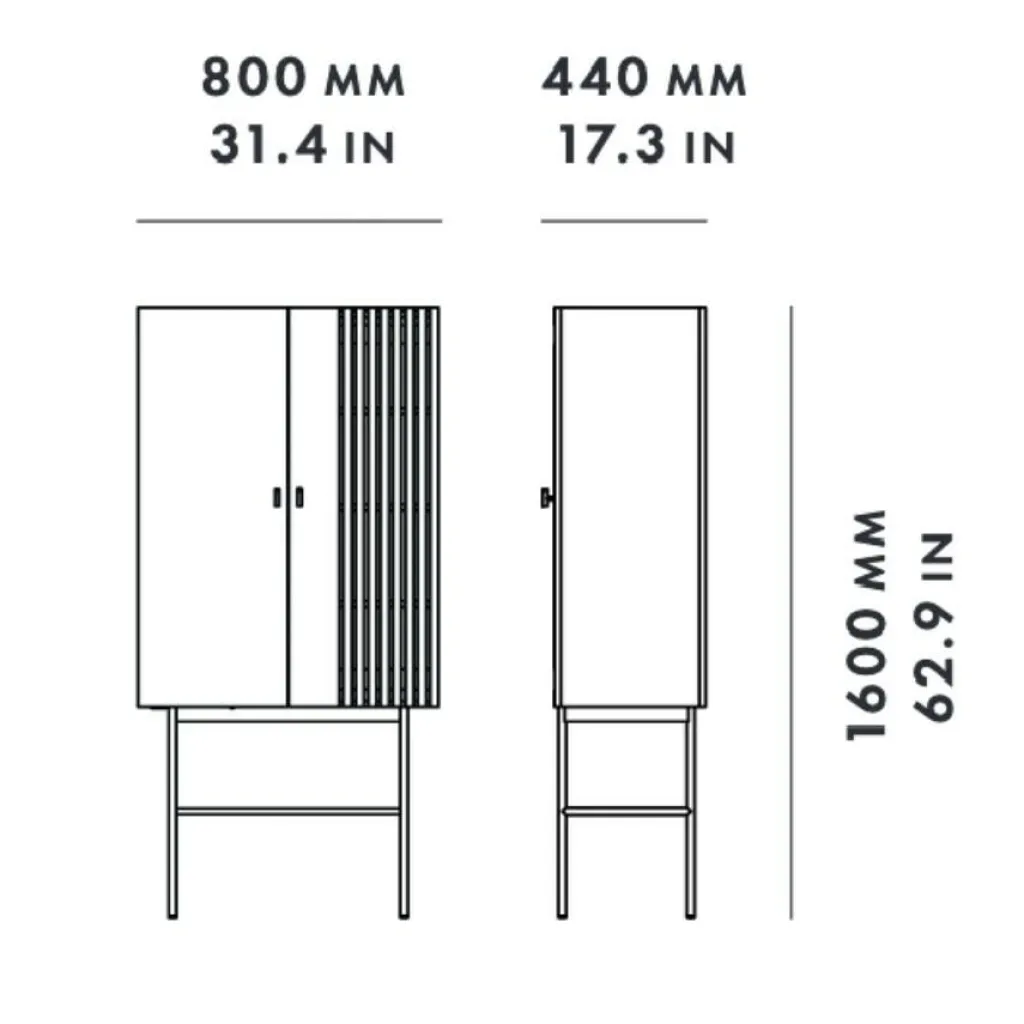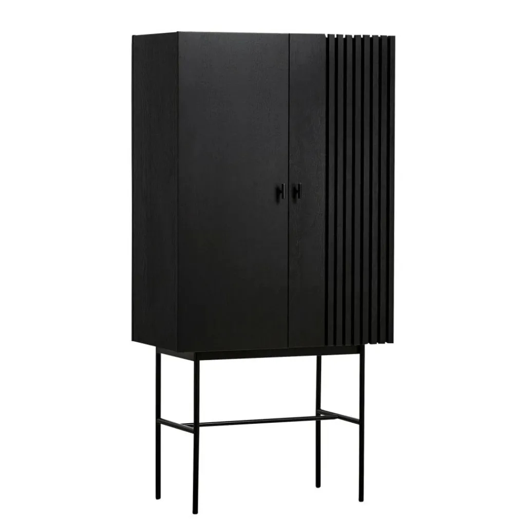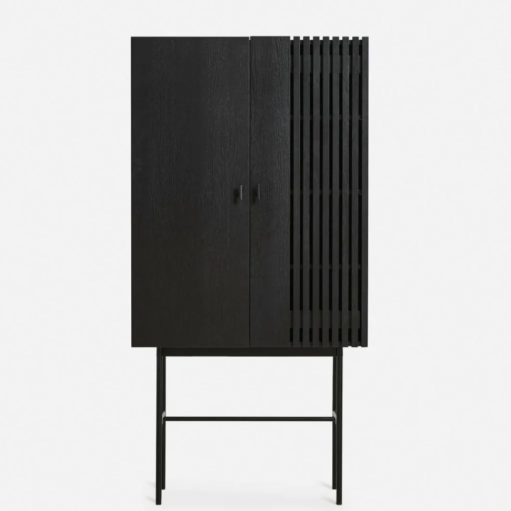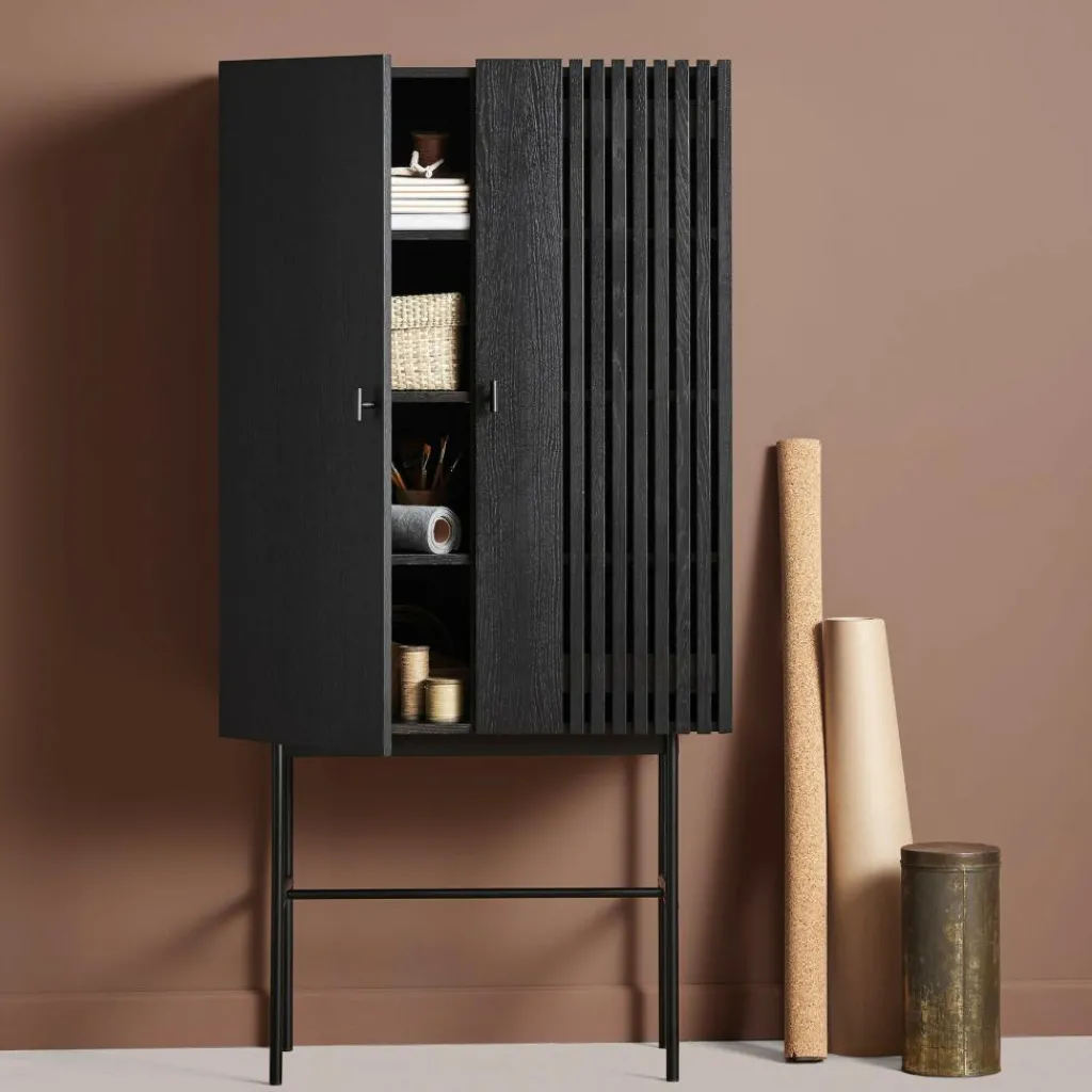 Inspiriert wurden die Designer von der modernen Architektur, die sich durch gerade Linien auszeichnet. Sie finden sich in der eleganten Front wieder, die an einer Seite feine Längsrillen zieren. In den Lamellen fangen sich Licht und Schatten und sie tragen zum stilvollen Gesamtbild bei. Hergestellt wird das Array Highboard 80cm aus Eichenfurnier und massivem Eichenholz, das aus Estland stammt. Die beiden Türen werden mit kleinen Griffen geöffnet und geschlossen. Einen interessanten Kontrast zum aus Naturmaterial hergestellten Korpus stellt das Gestell aus Eisen dar. Das Gestell besteht aus vier senkrechten Füßen, Querstreben sorgen für zusätzliche Stabilität.