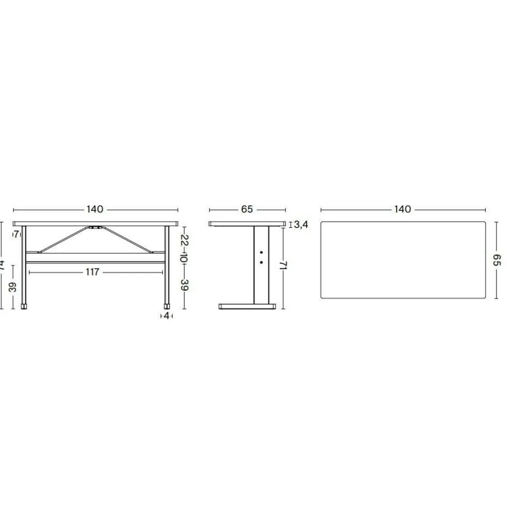 In die Füße sind Gleiter aus Plastik integriert. Damit können Bodenunebenheiten von bis zu 1,2 cm ausgeglichen werden. Der Tisch ist 140 cm breit. Die Tiefe beträgt 65 cm. Der Passerelle Schreibtisch hat eine Höhe von 74 cm. Er kann mit beliebigen Stühlen und Bürodrehstühlen kombiniert werden.