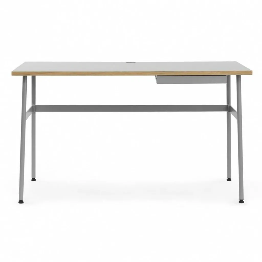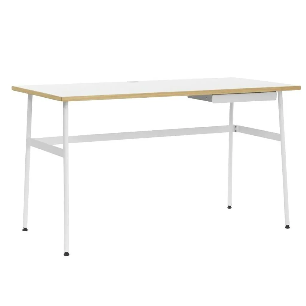 Der Journal Schreibtisch spielt gekonnt mit verschiedenen Materialen: Sicheren Stand gewährt dem Möbelstück ein filigranes Stahlgestell: Vier ausgestellte Stahlrohre mit Querverstrebungen an drei Seiten garantieren besten Stand. Einen interessanten Kontrast zu dem nüchternen Gestell bildet die Tischplatte: Sie besteht aus Laminat, einer pflegeleichten Oberfläche. Schmutz kann ganz einfach mit einem feuchten Tuch entfernt werden. In die Tischplatte eingearbeitete Kabelauslässe sorgen auf dem Journal Schreibtisch für Ordnung. An der rechten Seite befindet sich eine niedrige Schublade aus Stahl. Darin können Schreibwaren und andere Utensilien griffbereit aufbewahrt werden.