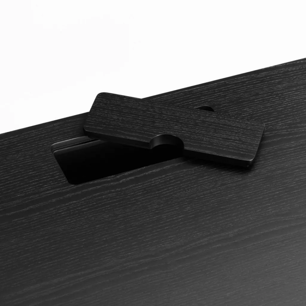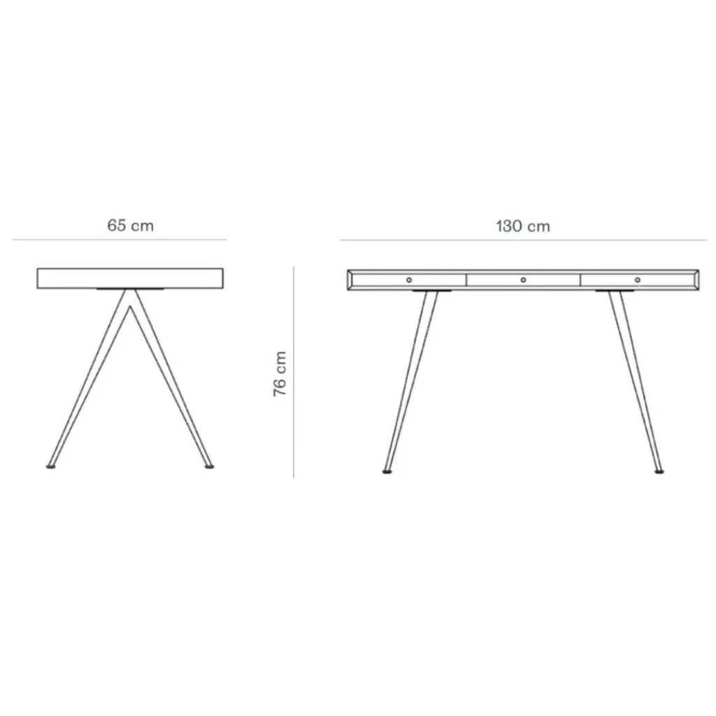Schon das Gestell des Schreibtisches ist ein richtiger Blickfang: Die vier Füße aus Aluminium mit einer matten Pulverbeschichtung sind ausgestellt. Weit darüber ragt an beiden Seiten die Tischplatte aus furniertem Holz. An der hinteren Seite ist eine kleine Abdeckung angebracht. Wird sie hochgehoben, wird darunter ein Auslass für Kabel sichtbar. Auf einer im Schreibtisch untergebrachten Ablage kann ein Stromverteiler platziert werden. Das Kabel dazu kann in einem Tischbein verborgen und somit unsichtbar zur nächsten Steckdose geführt werden. Ein weiteres liebevolles Detail sind die kleinen Knöpfe mit gerillter Oberfläche, die zum Öffnen der drei Schubladen dienen. Die unter der Tischplatte untergebrachten Schubladen sind 4 cm hoch.