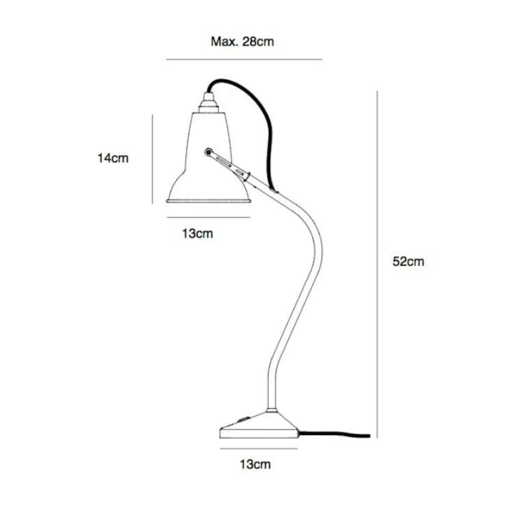 Für die Original 1227 Mini Tischleuchte benötigt man ein E14 Leuchtmittel, das nicht im Lieferumfang enthalten ist. Die Höhe der Lampe beträgt 52 cm, die Breite 28 und der Durchmesser 13 cm. Der elegante Standfuß hat einen Durchmesser von 13 cm. Korpus und Schirm sind aus Stahl gefertigt, der verchromt und leinenweiß lackiert ist. Mit dem 180 cm langen Anschlusskabel haben Sie eine großzügige Reichweite für diese Leuchte.