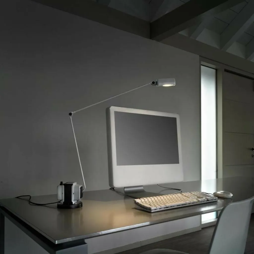 Als Basis dient der Daphine LED Schreibtischleuchte eine Scheibe aus Gusseisen. Darauf ist ein Trafto montiert. Er verleiht dem Modell zusätzliche Stabilität. An der Seite entspringt ein zweiteiliger Arm aus Metall, der durch ein Gelenk verbunden ist. Am Gelenk ist die Daphine LED Schreibtischleuchte um 270 Grad höhenverstellbar und schwenkbar. An der Basis kann man den Arm um 80 Grad schwenken. Der Leuchtenkopf ist in Zylinderform gemacht. Man kann ihn um 360 Grad drehen. Auch zwischen dem Leuchtenkopf und dem Gestell ist ein Gelenk eingebaut, das eine Bewegung um 200 Grad zulässt. Aus dem Diffusor an der Unterseite des Leuchtenkopfs dringt Licht nach unten aus. Die Daphine LED Schreibtischleuchte gibt warmweißes Licht ab.