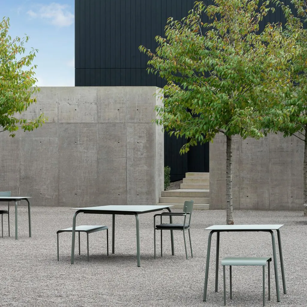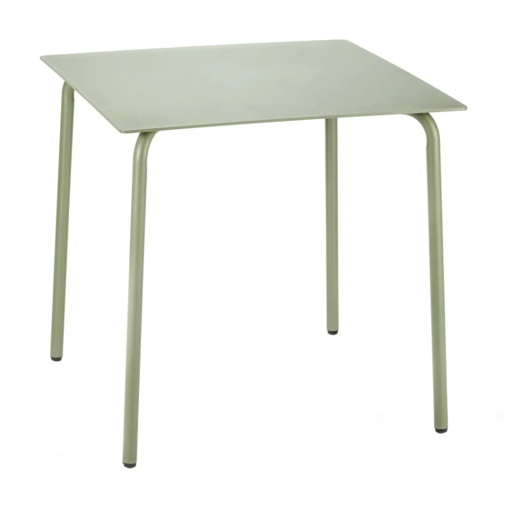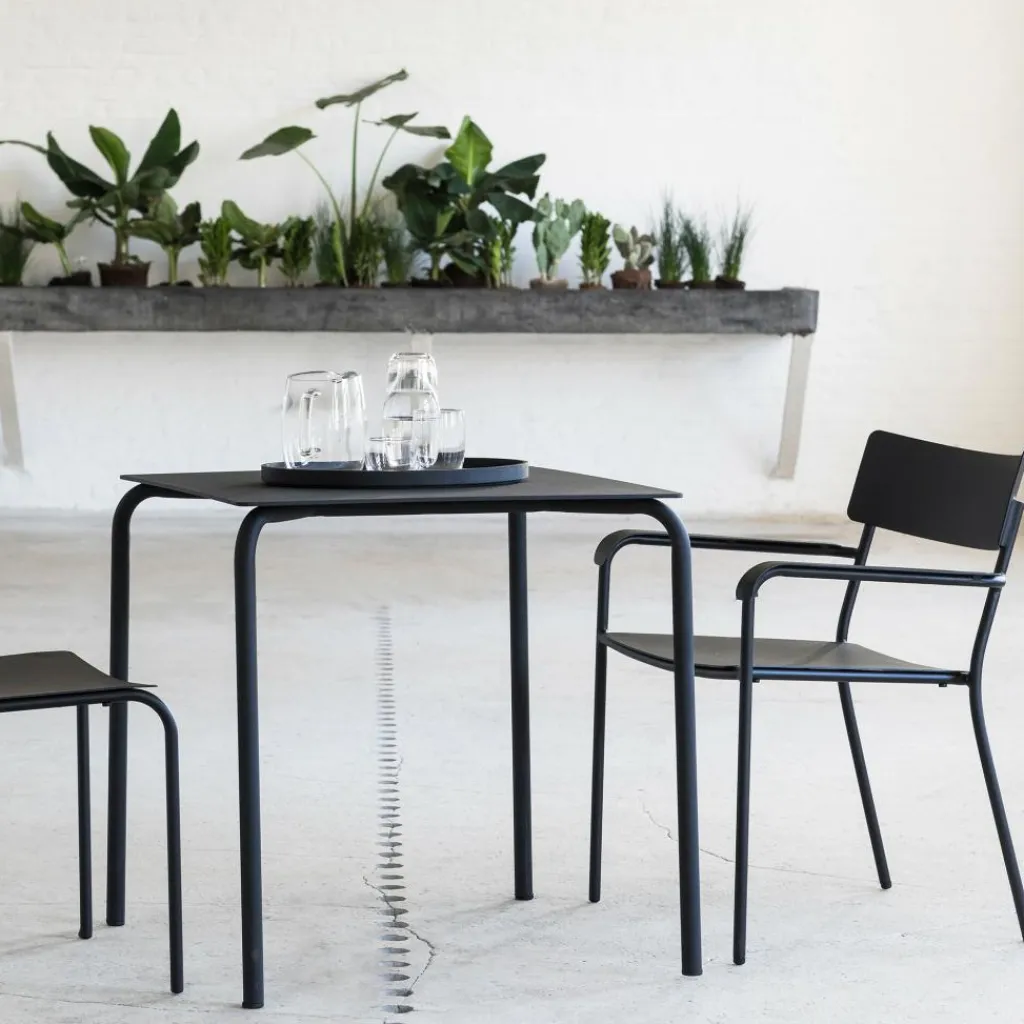 Simple Formen kennzeichnen den August Esstisch 75x75cm: eine dünne quadratische Platte auf vier Rundbeinen. Deren leicht ausgestellte Form verspricht eine hohe Belastbarkeit. Die mit Gummi besetzten Füße bieten zudem einen guten Stand. Gleichzeitig liegt die Tischplatte über den zur Mitte gebogenen Beinen stabil auf. Aus Aluminium gefertigt und mit einer hochwertigen Pulverbeschichtung versehen, eignet sich der August Esstisch 75x75cm ebenso für einen Platz unter freiem Himmel wie für einen modernen Innenraum. Seine fein strukturierte Oberfläche erzeugt einen matten Schimmer, was dem Designstück einen edlen Touch verleiht. So passt der schicke August Esstisch 75x75cm nicht nur auf die Hotelterrasse, sondern auch in ein stylishes Straßenrestaurant, in ein Gartencafé oder unter eine Laube im privaten Grün.