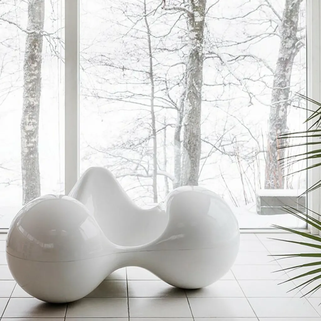 Die Kreisform als zentrales Element ist typisch für die Entwürfe des finnischen Designers. So setzt sich auch der Tomato Chair aus Kugelformen zusammen. Er verwendet zwei Kugeln als Armlehnen und lässt eine dritte mithilfe eines konischen Aufbaus zu einer Rückenlehne auslaufen. Der Sitz ist organisch in die äußere Form eingelassen und bildet eine Schale, die nach hinten sanft abfällt. Einen bequemen Sitzkomfort versprechen auch die stark abgerundeten Kanten, die darüber hinaus für einen homogenen Schattenwurf auf der glatten Oberfläche sorgen. Hergestellt aus witterungsbeständigem Fiberglas eignet sich der Tomato Chair ebenso für den Einsatz im Freien wie im Wohnraum. Er macht sich gut auf Holz- oder Steinböden einer Terrasse und passt auch mitten in die Wiese.