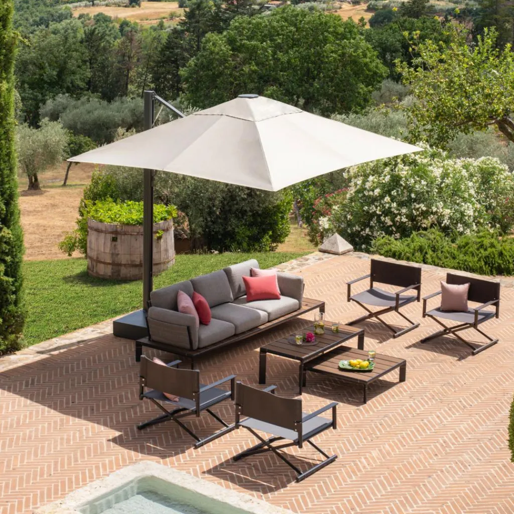 Der Terra Garten-Fußhocker klappbar wird mit seinem gekreuzten Gestell zum Blickfang. Die Armlehnen sind gerade geschnitten. Der Terra Garten-Regieloungestuhl klappbar besteht aus einem ausgeklügelten Materialmix. Das Gestell wird aus Aluminium gemacht. Es hat einen Korrosionsschutz und ist pulverbeschichtet. Das macht das Material widerstandsfähig gegen Witterungseinflüsse. Die breite Sitzfläche ist aus Emu-Tex gemacht. Dabei handelt es sich um ein robustes Material aus PVC-Garn. Die Rückenlehne des Terra Garten-Regieloungestuhls klappbar wird aus Kunstleder hergestellt, das aus Nylon besteht.