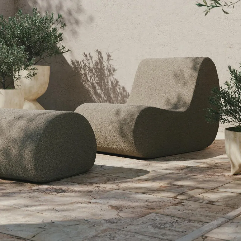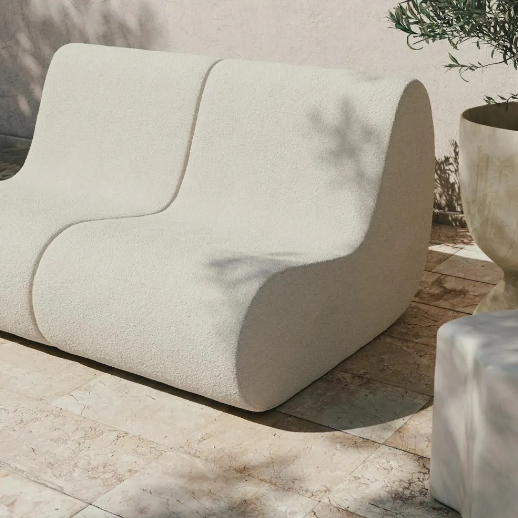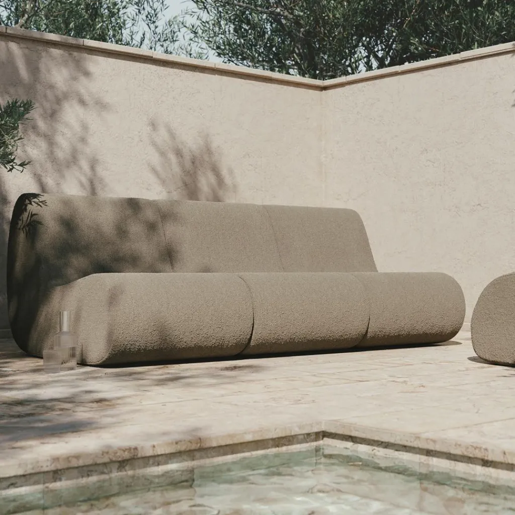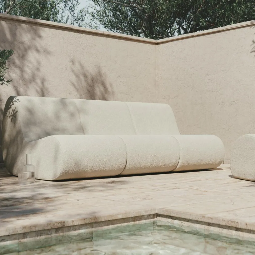 Als bequemes Sitzmöbel ist der Rouli Center Modul Sessel sowohl für den Innen- als auch für den Außenbereich geeignet und erfüllt damit höchste Ansprüche an hybrides Wohnen. Seine ausladenden Proportionen und abgerundete Form sind nicht nur von sanften Wellenbewegungen inspiriert, sondern auch von nostalgisch anmutenden Vintage-Liegesesseln historischer Hotels. Das Modell besteht aus einer Füllung aus hochelastischem PU-Schaum, der vakuumverpackt geliefert wird und 24 Stunden benötigt, um sich vollständig auszudehnen. Überzogen wird der Sessel mit einem abnehmbaren, leicht zu reinigenden Bezug aus Bouclé-Stoff mit wasserabweisender Rückseite aus Polyurethan und Polyester. Die Unterseite des Sessels wirkt rutschhemmend, ob im Wohnzimmer oder auf der Terrasse am Pool. Zum Schutz des Bodens sollte der Sessel getragen, nicht aber gezogen oder geschoben werden.