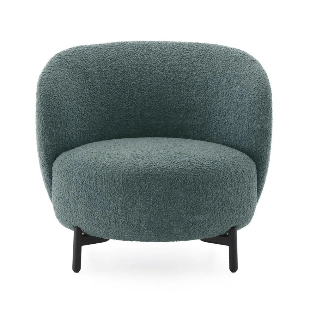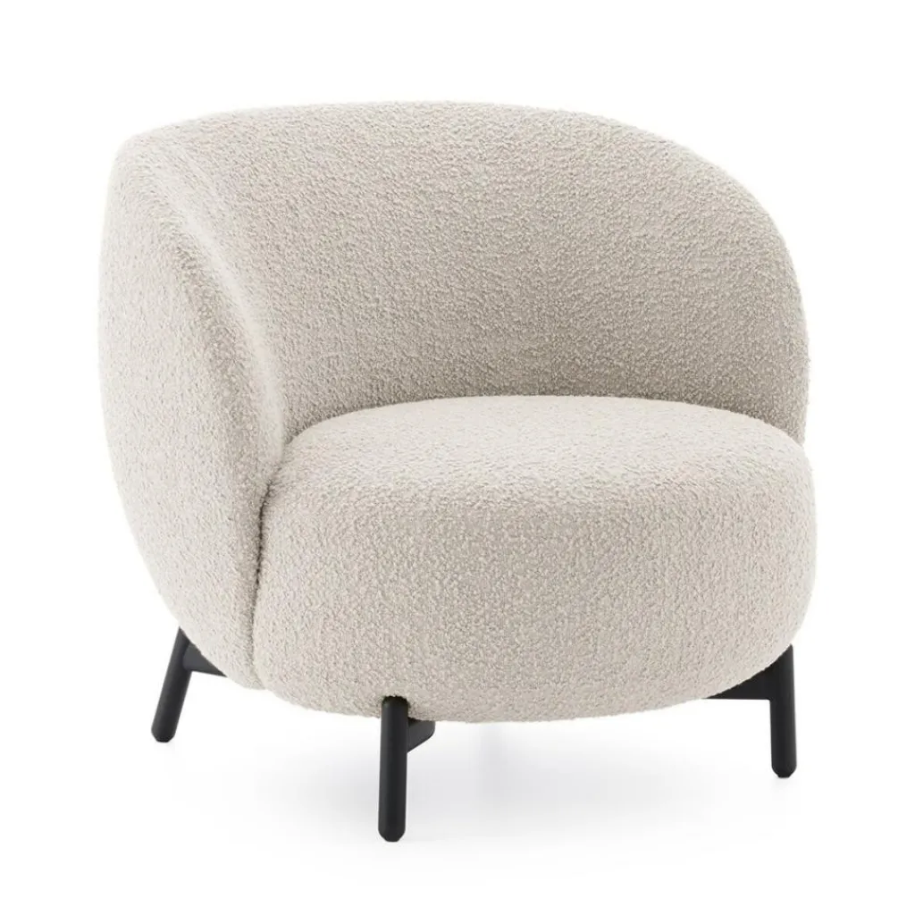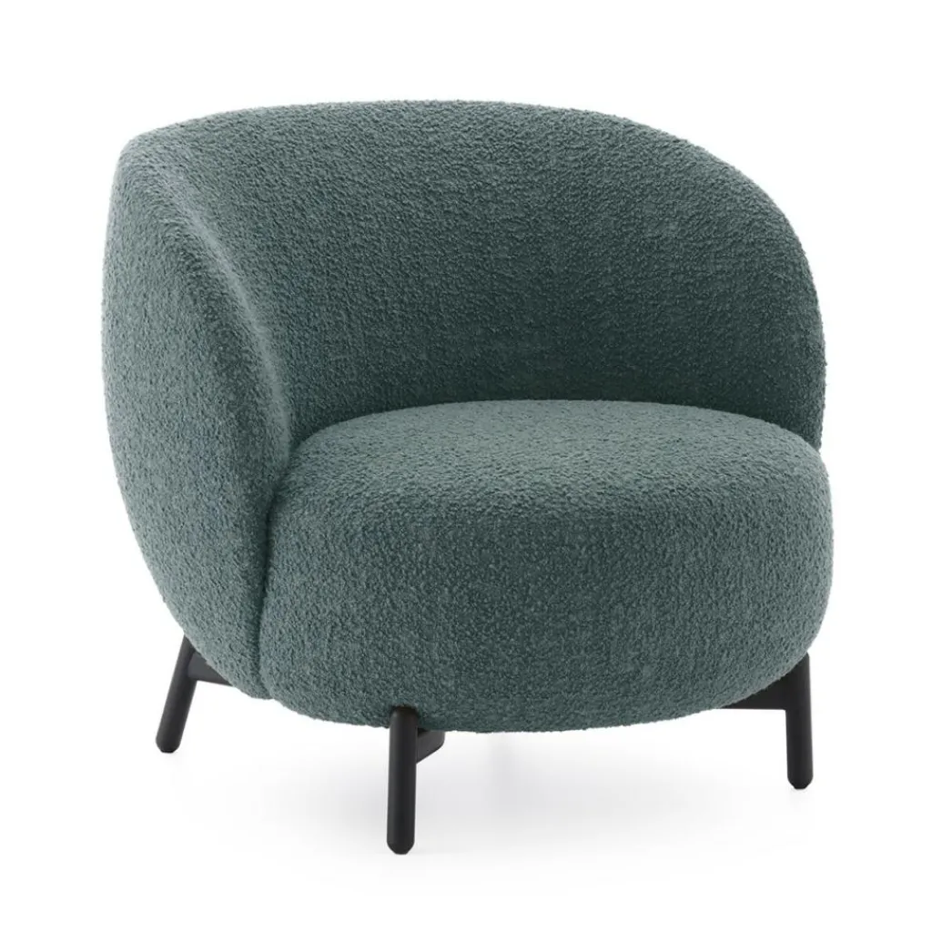 Eine minimalistische und gleichzeitig rundum gemütliche Formgebung ist charakteristisch für die Lunam-Serie. Der Lunam Sessel Curly besteht aus einer großzügigen Sitzfläche in sanft abgerundeter Form. Die geschwungene Rückenlehne in Schalenform geht direkt in die hohen Armlehnen über. Ein niedriges Gestell aus lackiertem Stahl mit vier leicht ausgestellten Beinen trägt die Polsterelemente. Die Sitzfläche und die Rückenlehne sind aus weichem Polyurethanschaum gearbeitet und mit Stoff bezogen. Der Bezug ist abnehmbar. Es stehen verschiedene Farben zur Auswahl. Die Stoffe sind aus einem Materialmix bestehend aus 22% Schurwolle, 22% Polyacryl, 22% Polyester, 14% Viskose, 13% Baumwolle und 7% Leinen gefertigt.