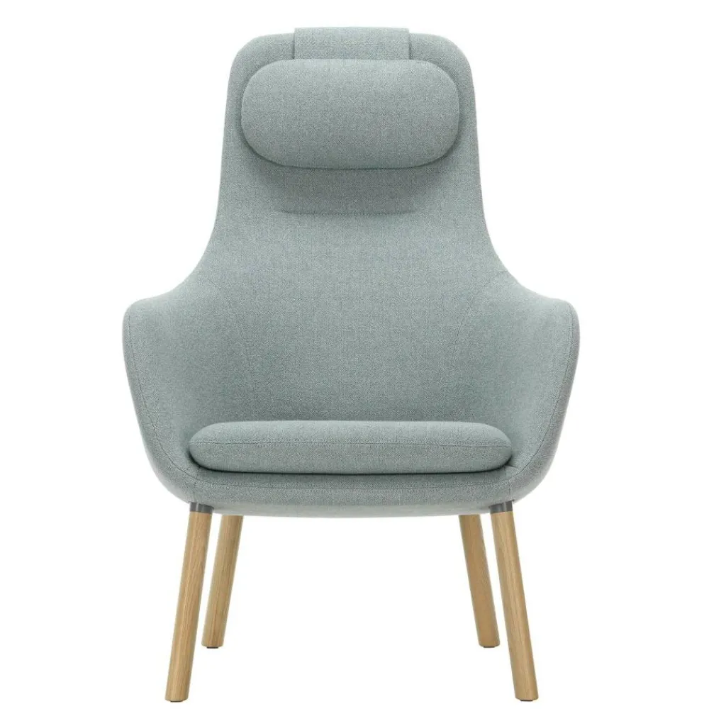 Der HAL Lounge Sessel strahlt in jedem Raum Ruhe aus: Er wird zum beliebten Rückzugsort im Wohnzimmer, Wintergarten, in der Hotellobby oder im Büro. Deutlich ausgestellte Hinterbeine garantieren dem Modell festem Stand, die vorderen Füße sind annähernd gerade geschnitten. Die Füße sind aus Eichenholz gefertigt. Sie sind mit Verbindungen aus Aluminiumdruckguss mit der einrahmenden Sitzschale verbunden. Den Kern bildet eine glasfaserverstärkte Schale. Sie besteht aus recyceltem ABS, das aus Industrieabfällen stammt. Der HAL Lounge Sessel ist mit Polyurethan-Formschaum gefüllt, was zum ausgezeichneten Sitzkomfort beiträgt. Der Bezug besteht aus hochwertigem Stoff. Das im Lieferumfang enthaltene Sitzpolster ist mit Polyurethanschaum gefüllt, das Nackenkissen mit silikonisierten Fasern und Faserkugeln.