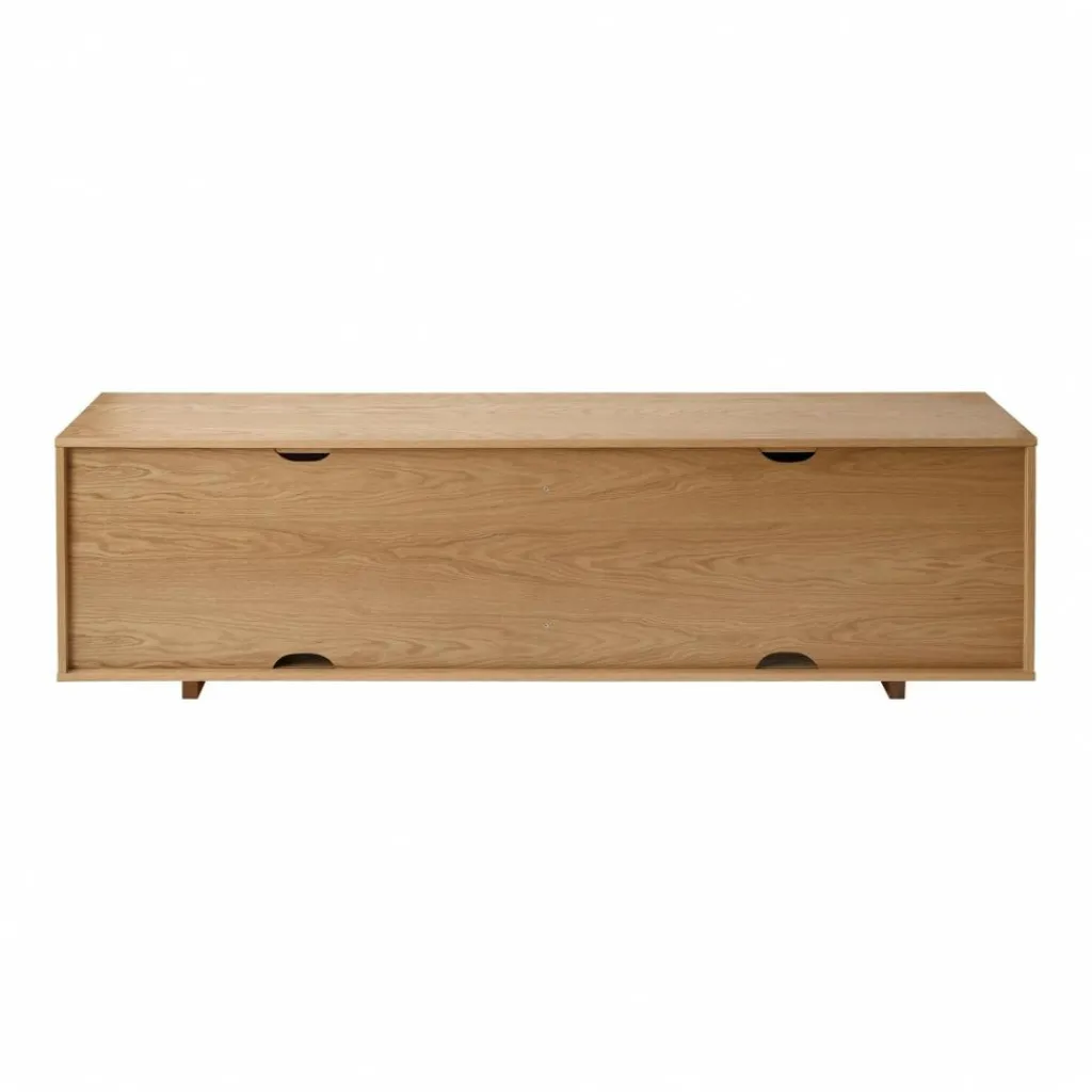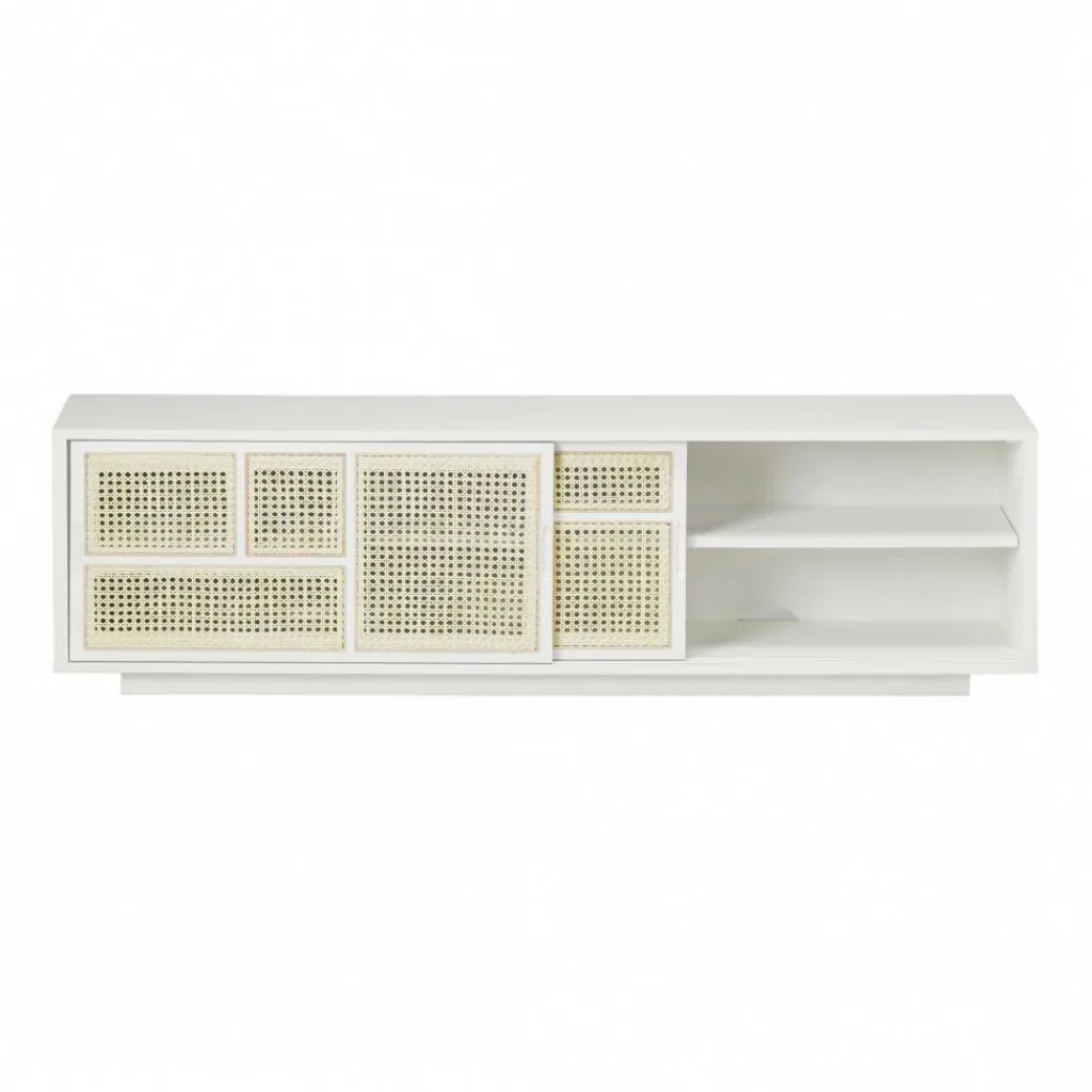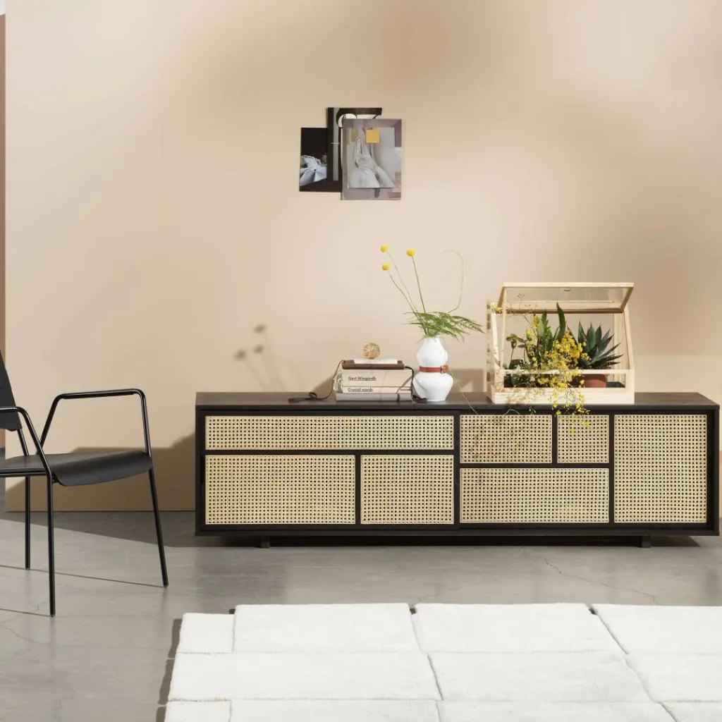 Wie bei traditionellen Rattanmöbeln sind beim Air Sideboard niedrig die Fronten aus löchrigem Material gefertigt. Dieses luftige Design hat der Kommode ihren Namen eingebracht. Das Sideboard steht auf einem niedrigen Sockel. Da der auffallende Korpus ihn überragt, scheint es als ob die Kommode im Raum schwebt. Zum Hingucker werden die Fronten: Sie bestehen aus unterschiedlich großen Rechtecken aus Rattan. Durch die kleinen Löcher lässt sich erahnen, was sich hinter den beiden Schiebetüren befindet. Der Korpus des Air Sideboard niedrig besteht aus gebeiztem Eschenholz. Da es an der Rückwand Auslässe für Kabel gibt, können Elektrogeräte angeschlossen werden.