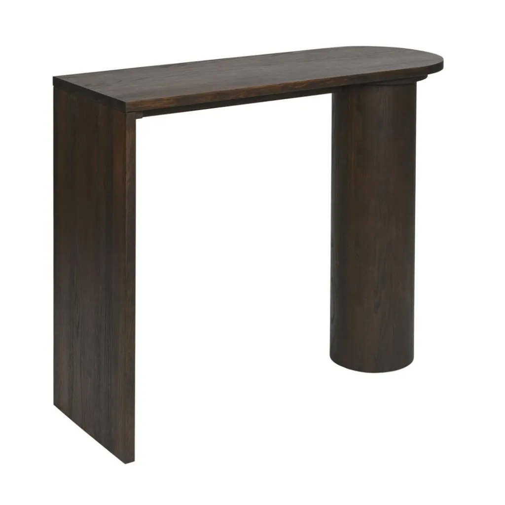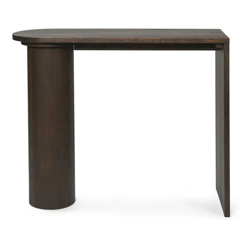 Markantes Merkmal dieses extravaganten Holzmöbels ist der tonnenförmige Standfuß, der einer wuchtigen Säule gleicht, während das gegenüberstehende Stützelement als Platte ausgebildet ist. Damit zeigt der Pylo Konsolentisch in der Ansicht eine auffällige Asymmetrie, die in den ungleichen Kantenformen der Tischplatte fortgesetzt wird. So bildet die längliche Tischfläche über der Pylon-Säule einen halbrunden Abschluss, während die andere Schmalseite gerade geschnitten ist. Der Pylo Konsolentisch ist aus massivem Eichenholz gefertigt. Sein Material stammt aus nachhaltiger Produktion. Das Möbelstück lässt sich parallel zu einer Wand platzieren und kann ebenso als trennendes Element in den Raum ragen. So passt der Pylo Konsolentisch in einen schmalen Flur oder in ein großzügiges Wohnzimmer, in eine edle Bar oder in eine stylishe Galerie. Seine mit einem klaren Öl gebeizte Oberfläche lässt sich mit einem feuchten Tuch einfach reinigen.