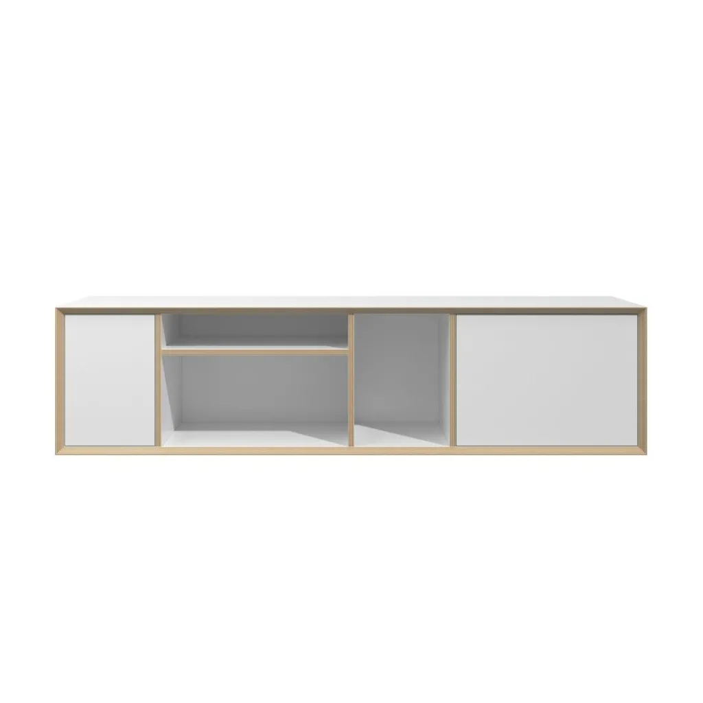 Das Vertiko Wide Two Sideboard gibt es in verschiedenen Farben. Der Korpus besteht aus Birkenschichtholz. Die 18 mm dicken Platten sind mit CPL beschichtet. Die Fronten werden ebenfalls aus MDF hergestellt und sind lackiert. Die Elemente sind auf Gehrung verleimt und behalten daher für viele Jahre ihre Stabilität. Das Vertiko Wide Two Sideboard wird dem Ruf nach modernen, flexiblen Möbeln gerecht. Es kann an der Wand befestigt oder auf den Boden gestellt werden. Mit Sitzkissen versehen, wird es zur Sitzgelegenheit im Vorraum. Gerne werden darauf Dekorationsartikel oder Hi-Fi-Geräte platziert. Das Sideboard hat eine große und eine kleine Tür links und rechts. Sie werden mit einem innovativen Push-to-open-Mechanismus geöffnet und verschlossen. Die drei Fachböden für den Mittelteil können nach Belieben eingesetzt werden.
