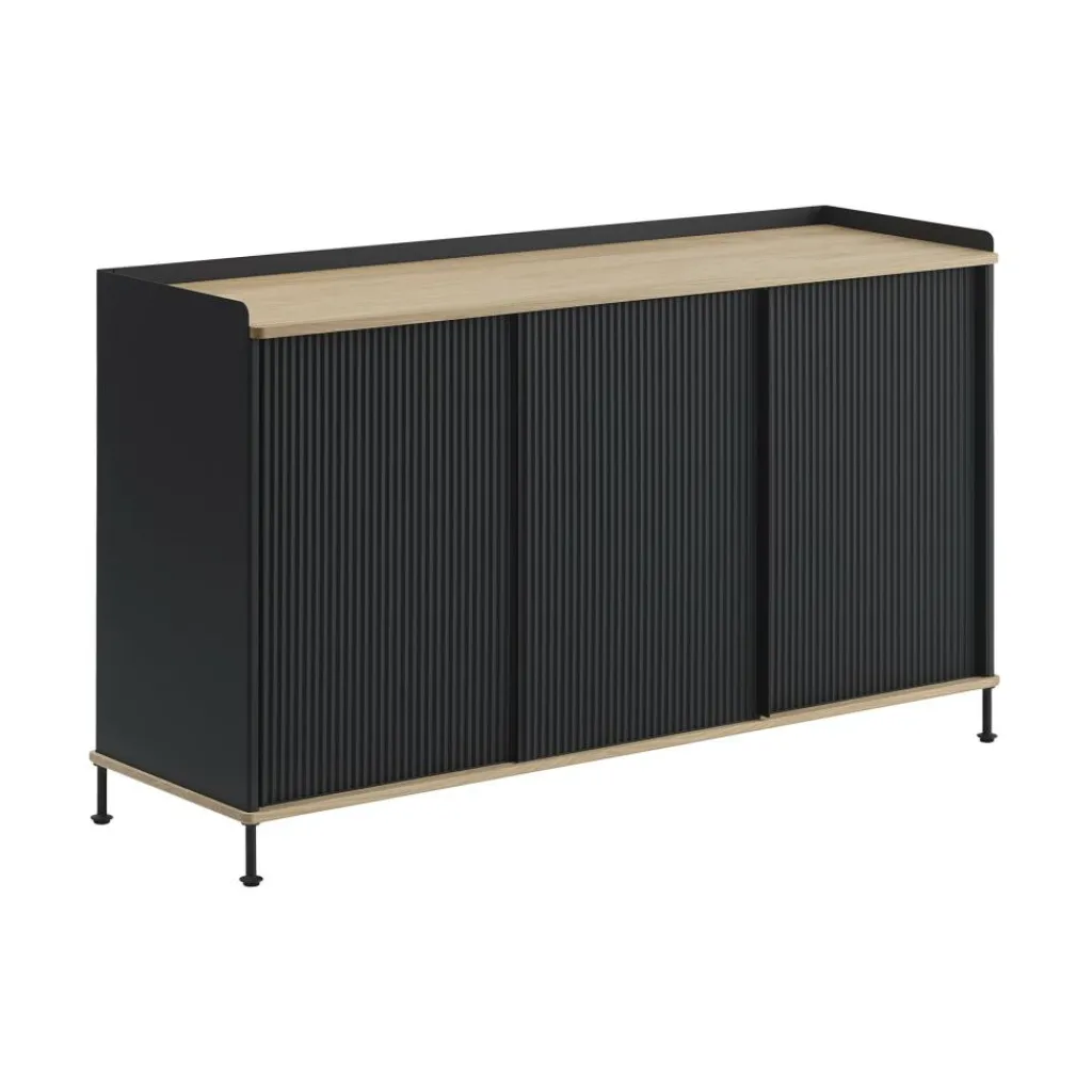 Seine hölzerne Abstellfläche verleiht dem Enfold Sideboard 148x45cm eine elegante Optik. Sie besteht ebenso wie der Boden des Aufbewahrungsmöbels aus hochwertigem Eichenholz, ist zartgemasert, geölt und beeindruckt mit einer sanften, warmen Haptik. Einen attraktiven Kontrast dazu bilden die Wände aus pulverbeschichtetem Stahl, das ein kühles Flair versprüht. Reizvolle Hingucker bilden die Schiebetüren, die mit ihren geriffelten Oberflächen attraktive Schatten werfen. Schlanke Beine aus Rundstahl schenken ihm eine leichte Optik. Für eine feste Stabilität sorgen die kleinen scheibenartigen Füße des Aufbewahrungsmöbels. So macht sich das Enfold Sideboard 148x45cm gut in kreativ gestalteten Büroräumen oder in einer modernen Praxis sowie im Wohnzimmer oder im Homeoffice. Zudem eignet sich das dekorative Aufbewahrungsmöbel für den Verkaufsraum einer Boutique.