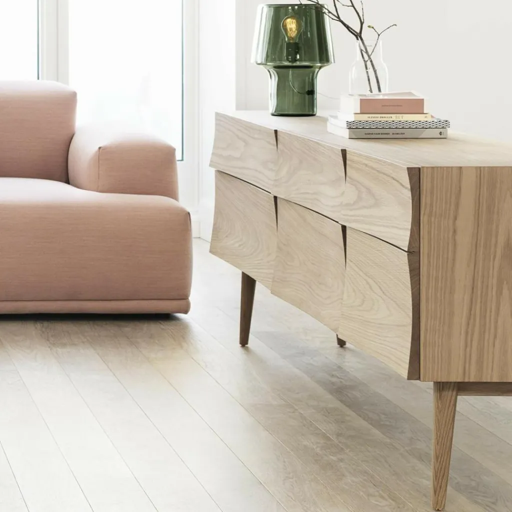 Als Inspiration für das kleine Reflect Sideboard von Muuto diente der natürliche Lichteinfall: „Reflect“ leitet sich von der gebogenen Oberfläche der Kommode ab, deren Kanten das Spiel von Licht und Schatten verstärken.