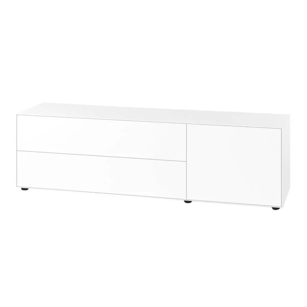 Die Nex Pur Box Schubkastenbox/Kommode 180×52,5cm ist Teil einer Kollektion und aus einer mitteldichten Holzfaserplatte MDF produziert. Die in der Farbe Weiß matt lackiert erhältliche Kommode hat die Abmessungen von 180cm in der Breite, 52,5cm in der Höhe und 48cm in der Tiefe. Die praktische Kommode mit viel Stauraum besteht aus zwei Schubläden auf der linken Seite und einem Fach, das mit dem Türanschlag auf der rechten Seite zu öffnen ist. Die mitgelieferten Gleitfüße der Nex Pur Box Schubkastenbox/Kommode 180×52,5cm von Piure mit einer Höhe von 2,5cm können dabei ganz einfach Unebenheiten des Fußbodens ausgleichen, um so für eine optimale Standfestigkeit zu sorgen. Die Tür der Kommode verfügt über ein Push-Pull-System. Diese auch Soft-Closing genannte Einrichtung ermöglicht fast geräuschloses Öffnen oder Schließen der Kommode, indem man nur ganz leicht gegen die Tür drückt.