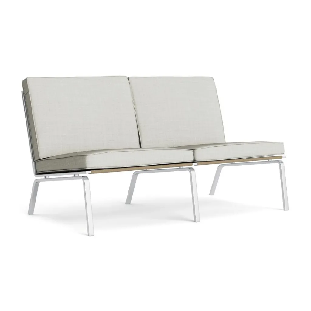 Ein minimalistisch geformter Rahmen bildet den Unterbau dieses Designmöbels, deren glänzend polierte Stahlkonstruktion zweckmäßig und gleichzeitig edel wirkt. Die Sitzfläche fällt leicht nach hinten ab, auch die Lehne ist leicht geneigt. Die dicken Polster für Sitzfläche und Lehne versprühen einen gemütlichen Charakter. Ihre rechteckigen Formen passen sich schlicht an den geradlinigen Stil des Sitzmöbels an. Der Bezugsstoff, der sich aus Schurwolle und einem Nylon-Garn zusammensetzt, macht das Sofa langlebig und strapazierfähig. Damit passt das Man 2-Sitzer Sofa perfekt in ein modernes oder im Retro-Stil gestaltetes Wohnzimmer und macht sich ebenso gut in der Lobby eines Hotels, im Wartebereich einer Praxis oder im Pausen- oder Vorzimmer des Büros.