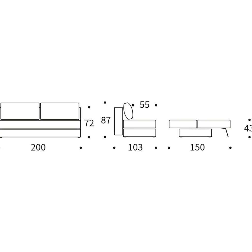 | Abmessungen | Breite: 200cm Höhe: 87cm Tiefe: 103cm Sitzhöhe: 43cm Höhe Liegefläche: 43cm |