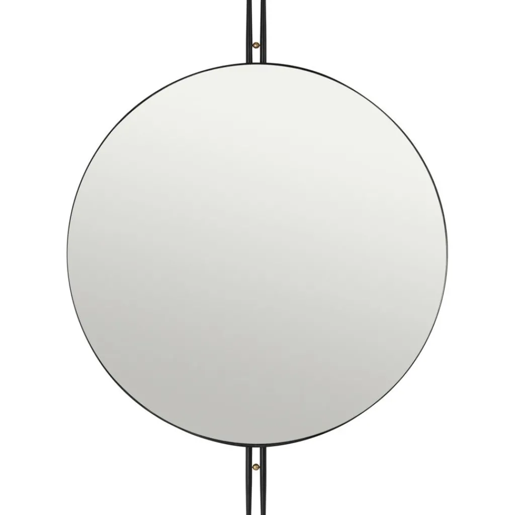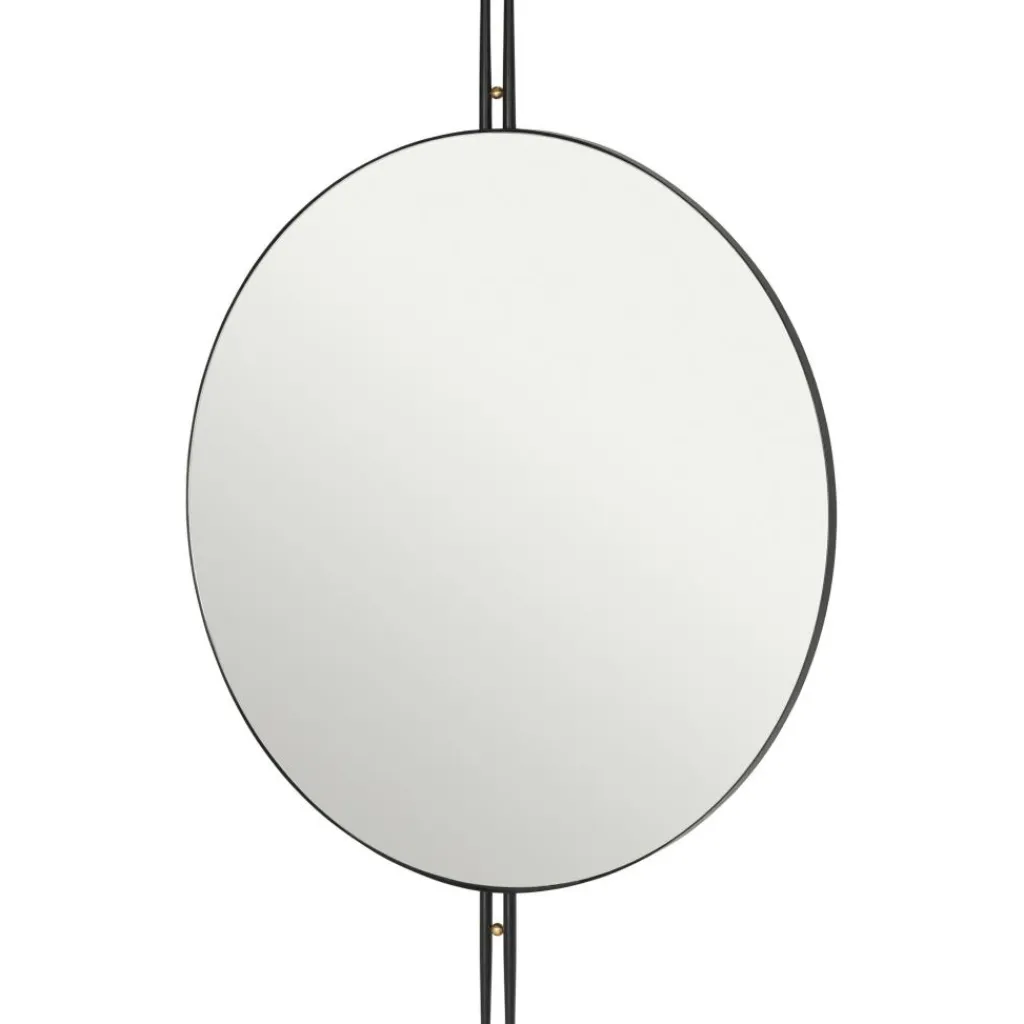 Eine großzügige kreisrunde Fläche aus Spiegelglas, eingefasst von einem dezenten dunklen Metallrahmen, steht im Zentrum des Entwurfs für den IOI Wandspiegel Ø80cm. Sein senkrechtes, lang gestrecktes Format erhält das edle Designstück durch zwei Metallornamente, die am oberen und unteren Scheitelpunkt des Rundspiegels angeordnet sind. Diese setzen sich jeweils aus zwei Rundstäben aus schwarzem, halbmattem Stahl zusammen, die nach außen hin konisch zusammenlaufen und durch eine kleine glänzende Messingkugel miteinander verbunden sind. Dank dieser minimalistischen Verzierung knüpft der IOI Wandspiegel an das traditionelle Spiegeldesign an.