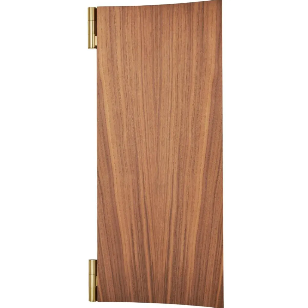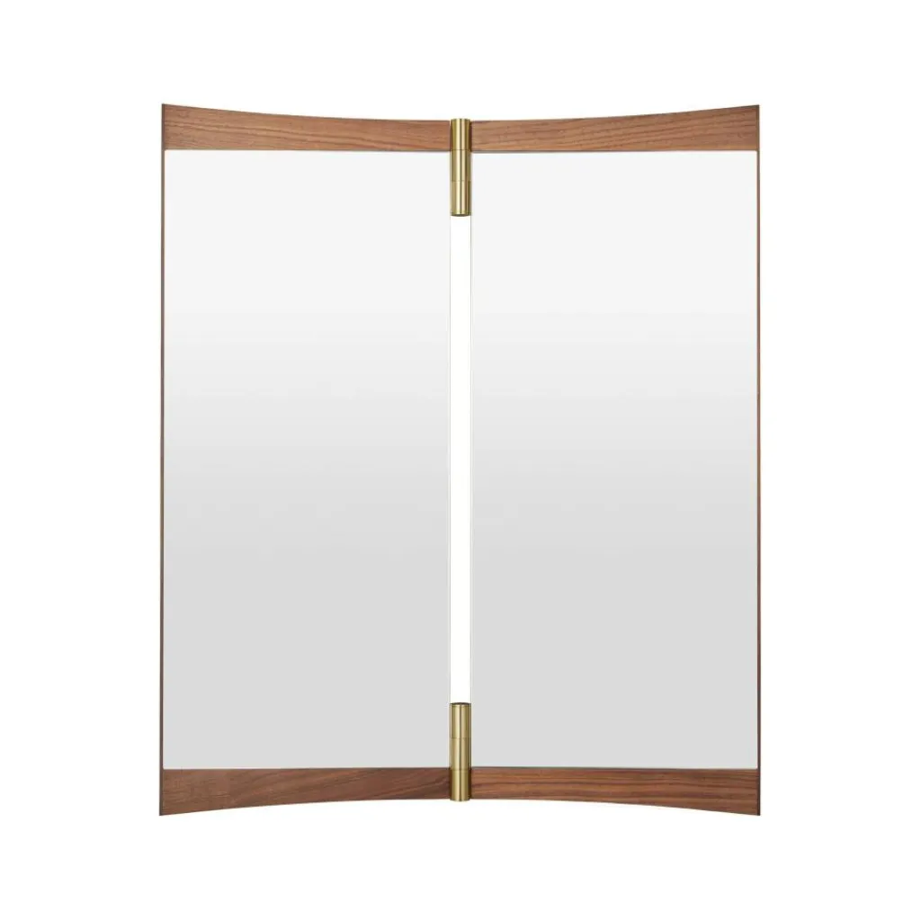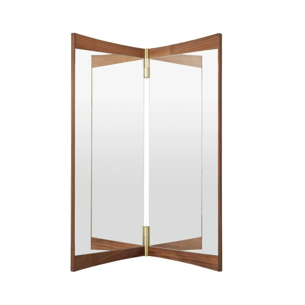 Beim Vanity 2 Wandspiegel handelt es sich um eine stilvolle Dekoration, die viel Flexibilität bietet. Er wird aus zwei Paneelen hergestellt. Sie sind mit zwei auffallenden Messingscharnieren verbunden. Mit ihrer Hilfe lässt sich die Position der Paneele individuell gestalten. Man kann den Vanity 2 Wandspiegel ganz zuklappen, halb offen oder ganz geöffnet verwenden. Die in Präzisionsarbeit hergestellten Scharniere lassen eine Rotation um 180 Grad zu. Das hochwertige Spiegelglas ist auf zwei Platten aus amerikanischem Walnussholz befestigt. Das Furnier weist eine deutliche Maserung auf. Im Vanity 2 Wandspiegel kann man nicht nur prüfen, ob die Frisur und das Outfit perfekt sitzen. Darin spiegeln sich auch Lichtstrahlen und Einrichtungsgegenstände, was den Raum größer erscheinen lässt.