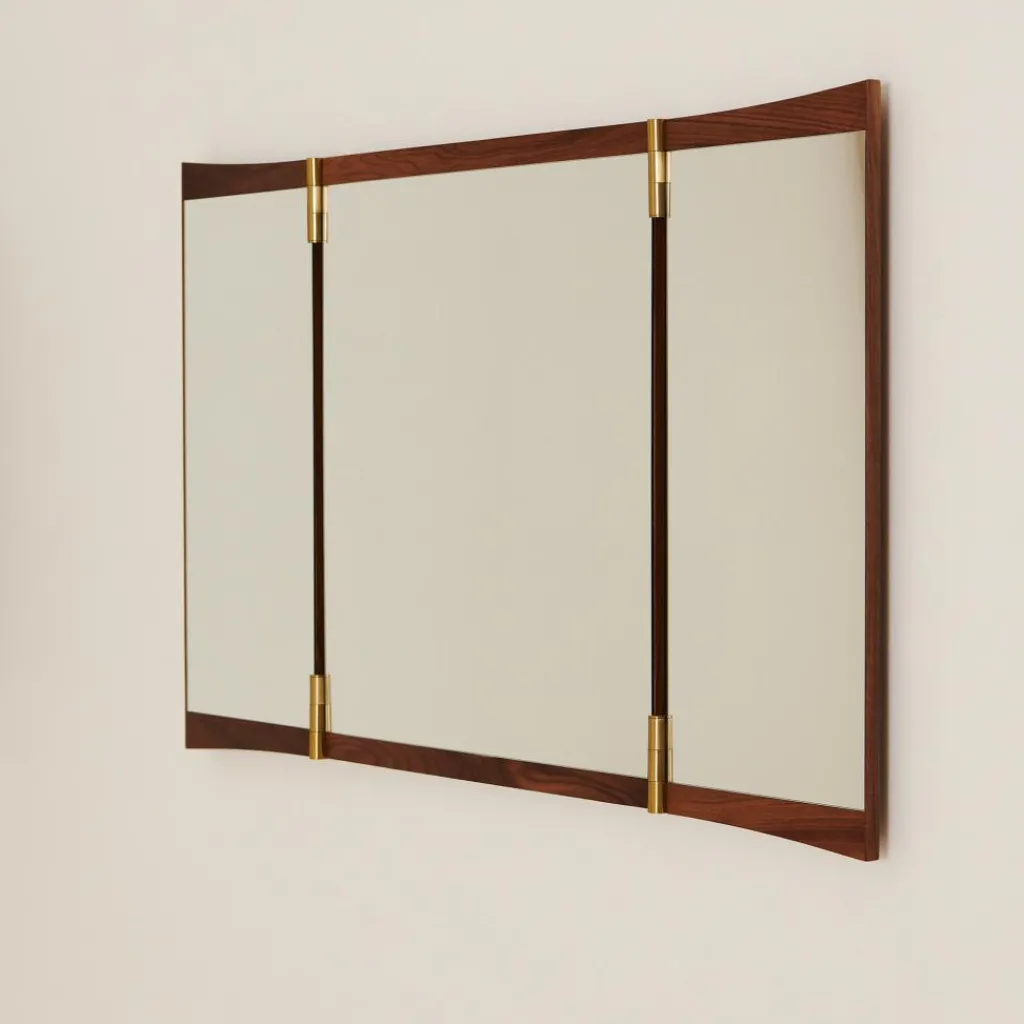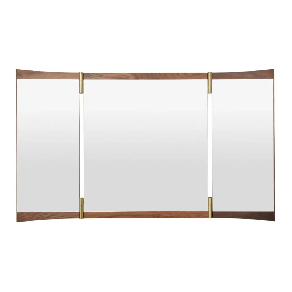 Der Vanity 3 Wandspiegel ist ein Meisterwerk traditioneller Handwerkskunst. Er ist auf edlen Paneelen aus amerikanischem Walnussholz befestigt. Die drei Elemente sind mit Scharnieren miteinander verbunden. Sie werden aus Messing gemacht und dienen zur Wandbefestigung. Mithilfe der Scharniere können die einzelnen Paneele um 180 Grad gedreht werden. So ist es möglich, den Vanity 3 Wandspiegel völlig zu verschließen. Damit ist der Spiegel vor Staub geschützt, wenn er gerade nicht in Verwendung ist. Stellt man die seitlichen Teile in einen 90-Grad-Winkel, kann sich der Betrachter auch von der Seite betrachten. Die Holzpaneele ragen oben und unten deutlich über die Spiegelfläche hinaus.