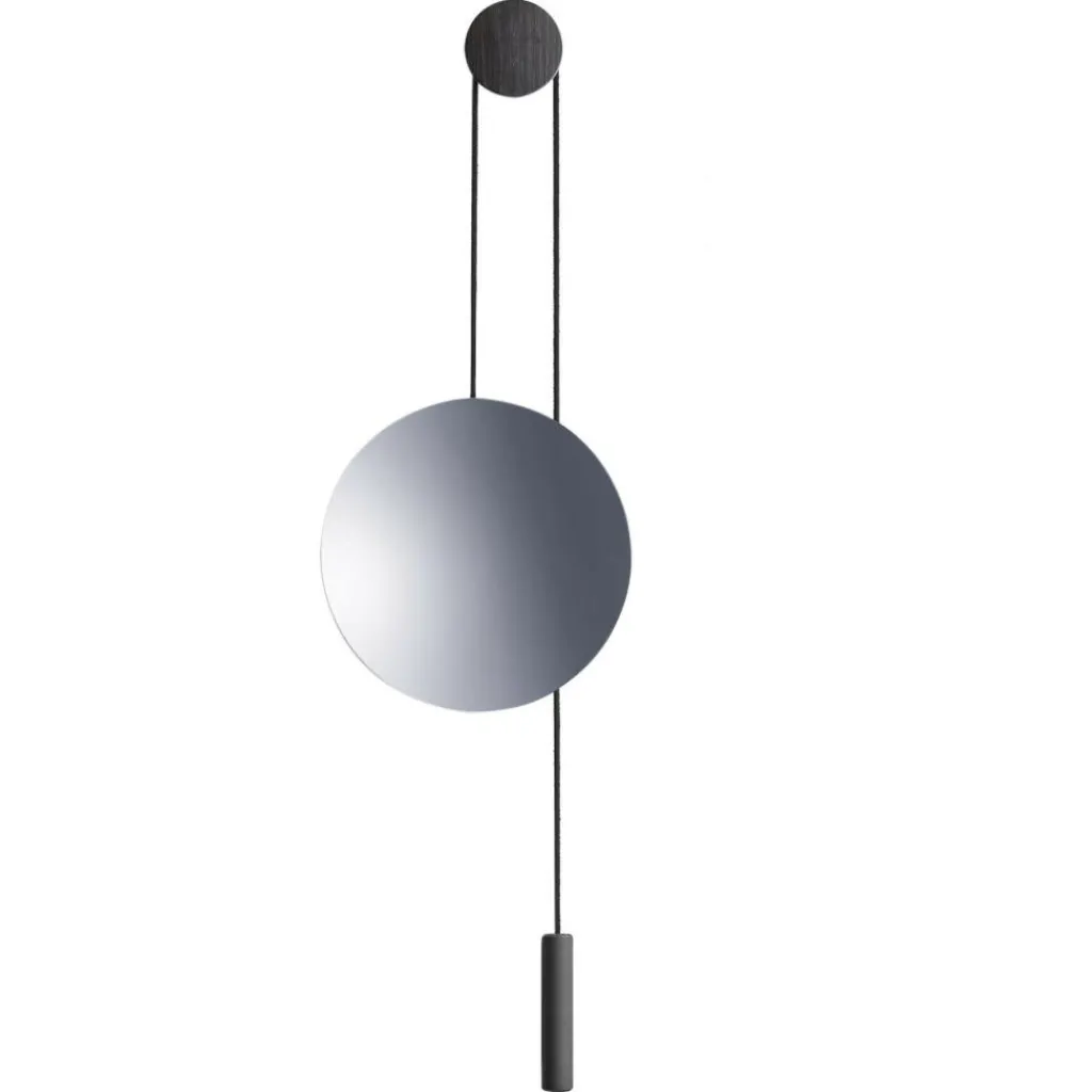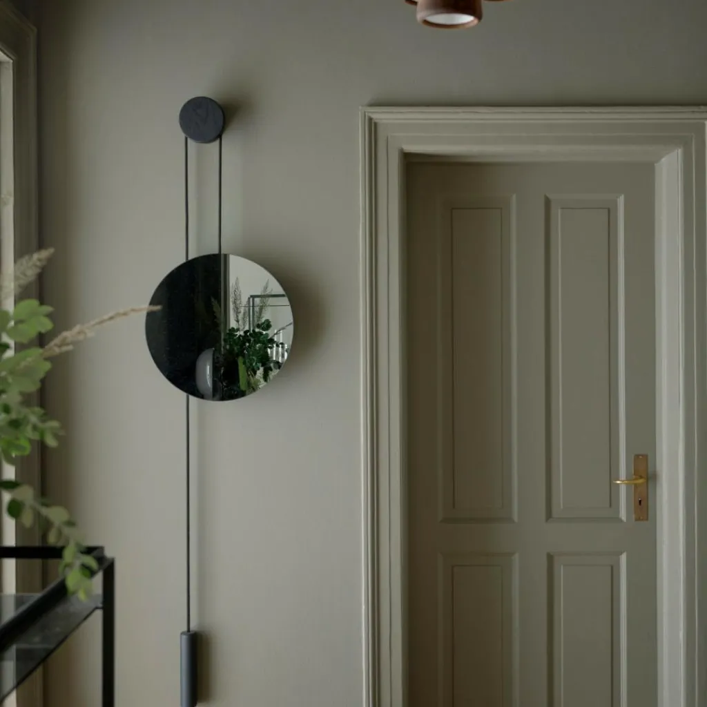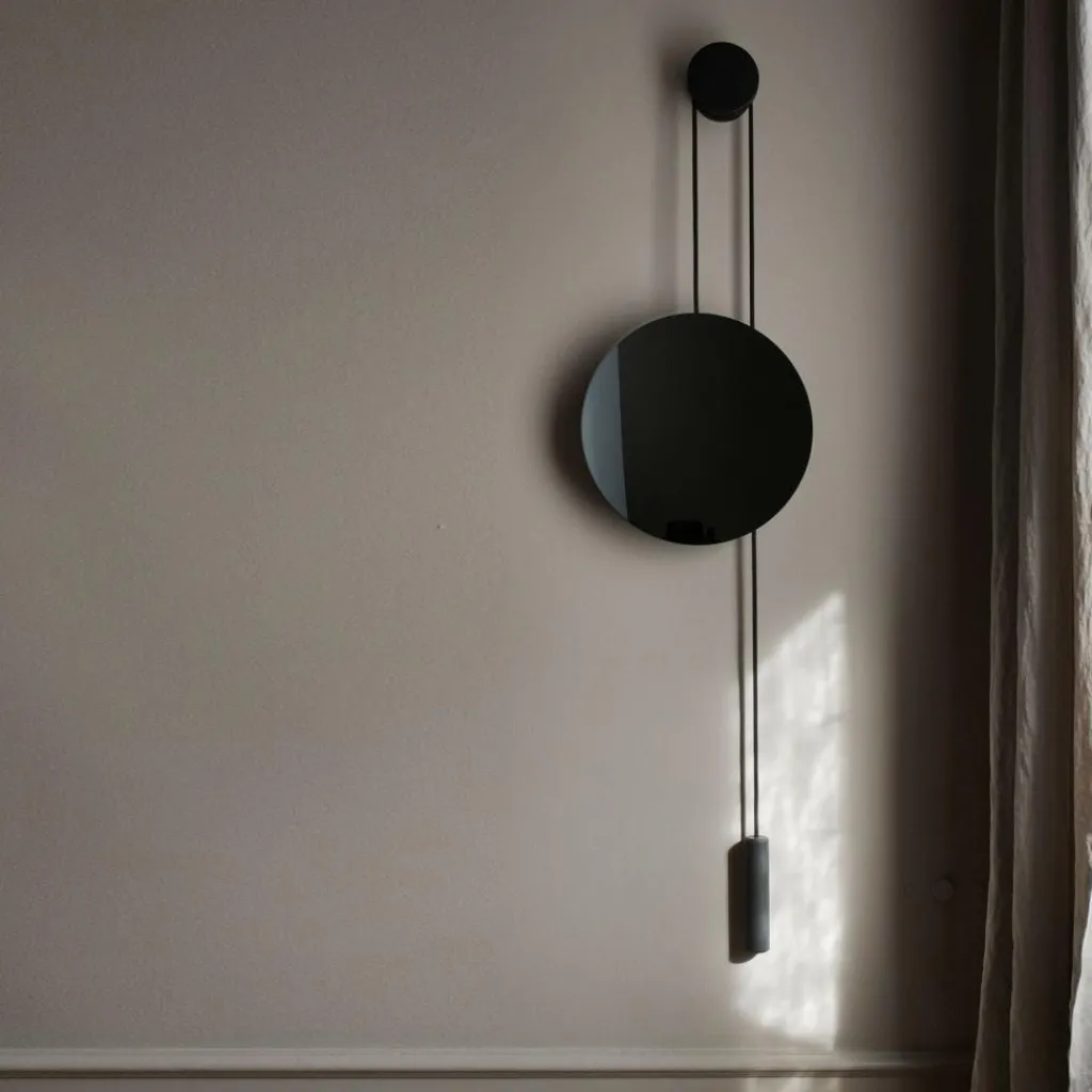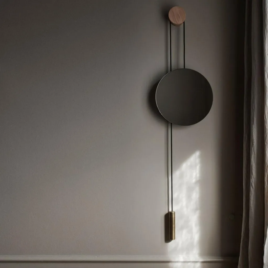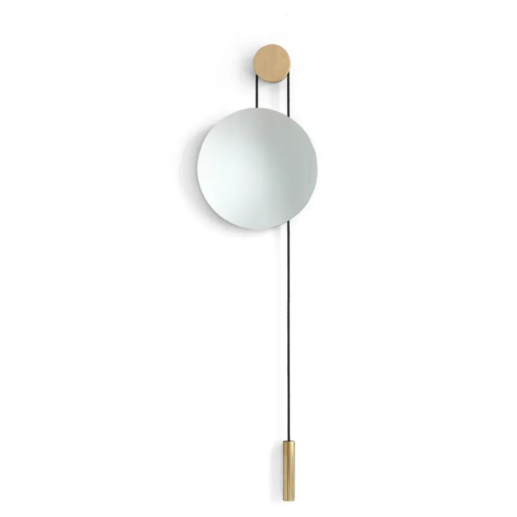Vorgestellt wurde der stilvolle Rise & Shine Wandspiegel im Jahr 2016. Ganz eindeutig werden bei der Betrachtung Assoziationen mit einer mechanischen Wanduhr geweckt. Wie eine aufgehende Sonne scheint der Spiegel an der Wand und verbreitet elegante Atmosphäre in jedem Raum. Geeignet ist das Modell für das Wohn- oder Schlafzimmer, es macht jedoch auch im Büro oder in einem Hotel eine gute Figur. Der Spiegel besteht aus einem Mittelpunkt aus edlem Eichenholz, der als Wandhalterung dient. Er ermöglicht dem Spiegel und dem Pendel aus Messing, sich gegeneinander zu ziehen und zu drücken. So schafft der runde Spiegel aus Glas einen sich stets verändernden Reflexionspunkt. Der Spiegel hängt an einer Schnur, die um die Wandhalterung gewickelt wird. Als Gegengewicht dient das Pendel, das es auch aus Stahl gibt.