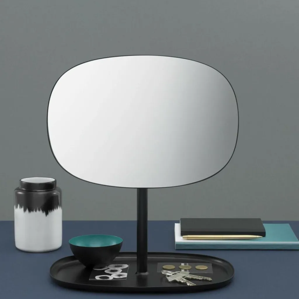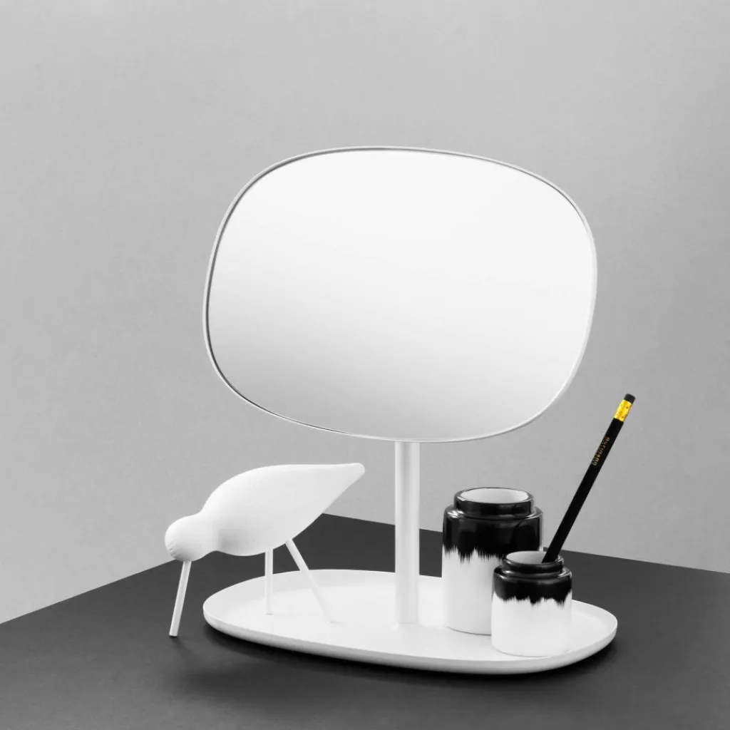 Der Standspiegel Flip von Normann Copenhagen dient zum einen als moderner Kosmetikspiegel im Flur oder in Bade-/Schlafzimmer und zum anderen bietet sein Fuß eine praktische Ablagemöglichkeit. Für das multifunktionale Design wurde Flip 2013 für den Best of the Year Interior Design Award nominiert.