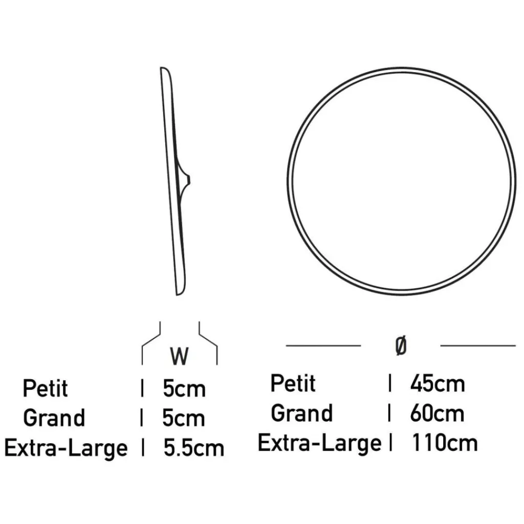 | Abmessungen | Tiefe: T 5,5cm : 5.5cm T 5cm: 5cm T 5cm : 5cm Durchmesser: Francis Extra Large Wandspiegel Ø110cm: 110cm Francis Large Wandspiegel Ø60cm: 60cm Francis Small Wandspiegel Ø45cm: 45cm |
