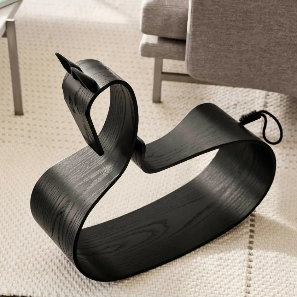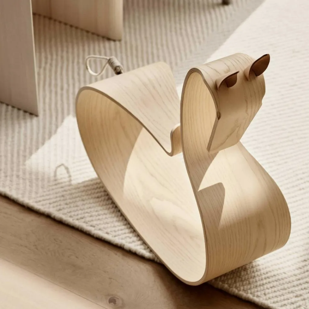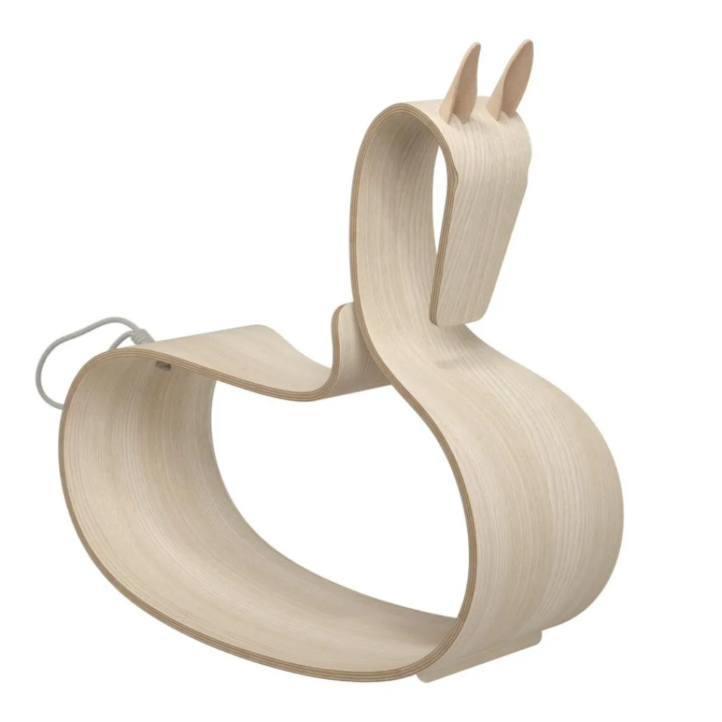 Das Schaukelpferd wurde für die Marke Fritz Hansen entworfen. Die verspielte Kreation stammt aus dem Jahr 1946 und markiert den Beginn einer Design-Ära, in der formgepresstes Furnierholz im Möbeldesign Bedeutung erlangte. Damit ist es nicht nur ein Stück Handwerksgeschichte. Das Design ist auch bezeichnend für die Ambitionen, jede beliebige Form aus dem damals innovativen Material möglich zu machen. Das neu aufgelegte Designobjekt ist eine Hommage an die Pionierarbeit dieses kunstvollen Handwerks.