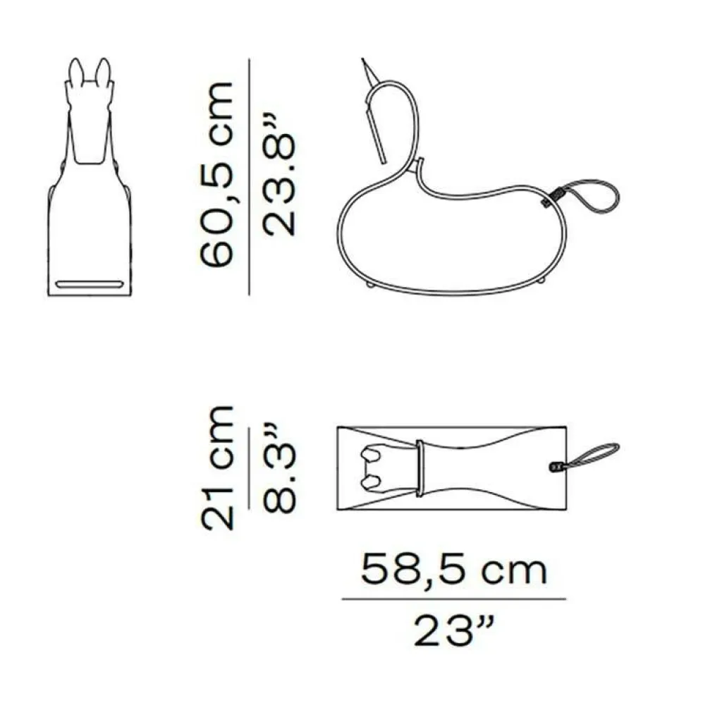 Das Schaukelpferd hat eine Länge von 58,5cm. Es ist 21cm tief und misst 60,5cm in der Höhe. Sein Gewicht ist 2,5kg. Die Skulptur ist in verschiedenen Farben erhältlich.