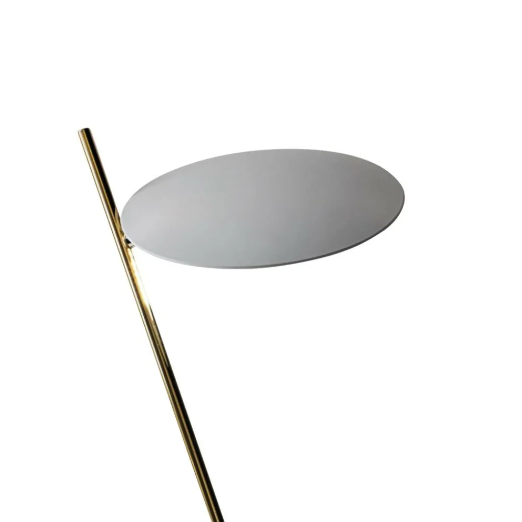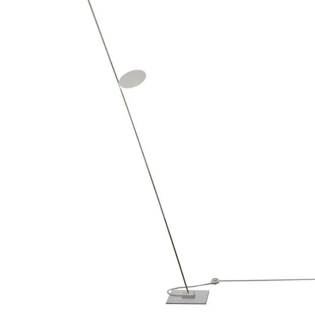 Die Lederam F1 Stehleuchte besteht aus einem viereckigen Fuß in Schwarz oder Weiß, der die Maße 20 cm x 20 cm hat. Auf ihm ist ein Quader in derselben Farbe mit den Maßen 7 cm x 7 cm befestigt, von dem schräg ein langer schmaler Stab abgeht. Mit einem Gelenkscharnier ist daran eine Scheibe im Durchmesser von 17 cm angebracht, die sowohl in der Höhe als auch im Winkel verstellt werden kann. Ein LED-Leuchtmittel, das auf der Innenseite der Scheibe befestigt ist, sorgt für eine indirekte Beleuchtung und wirft helle Kreise auf die Wand oder Decke. Die Lederam F1 LED Stehleuchte, die eine Höhe von 175 cm hat, ist in verschiedenen Ausführungen erhältlich. Ein schwarzer Sockel und Stab kann mit einer kupfer- oder goldfarbenen Scheibe kombiniert werden, ein satiniertes Gestell mit einem satinierten Stab wird mit einer Scheibe aus Chrom geliefert und ein weißes Gestell mit goldenem Stab und weißer Scheibe.