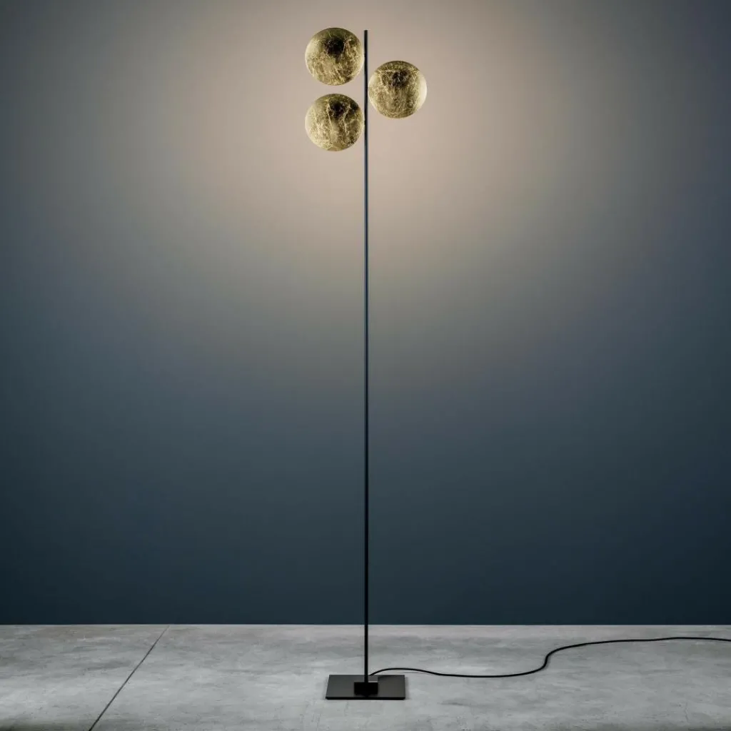 Die Lederam F3 Stehleuchte besteht aus einem viereckigen Fuß, auf dem ein kleinerer Baldachin mit den Maßen 7 cm x 7 cm angebracht ist. An dem Baldachin ist ein langer Stab befestigt, der drei Scheiben aus Aluminium und Nickel Halt gibt, die jeweils einen Durchmesser von 17 cm haben. Die Leuchtmittel sind an den Innenseiten der Scheiben befestigt und erzeugen eine indirekte Beleuchtung. Insgesamt hat die Lederam F3 Stehleuchte eine Höhe von 175 cm. Sie ist in verschiedenen Farbvarianten erhältlich. Ein schwarzer Sockel und Stab lässt sich mit kupfer- und goldfarbenen Scheiben kombinieren, ein weißes Gestell mit goldenem Stab und weißer Scheibe und ein satiniertes Gestell mit einem satinierten Stab und einer Scheibe aus Chrom.