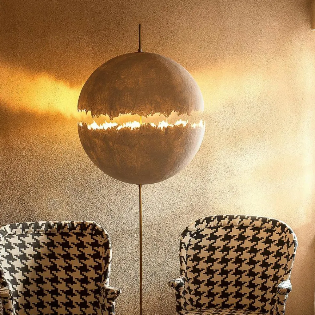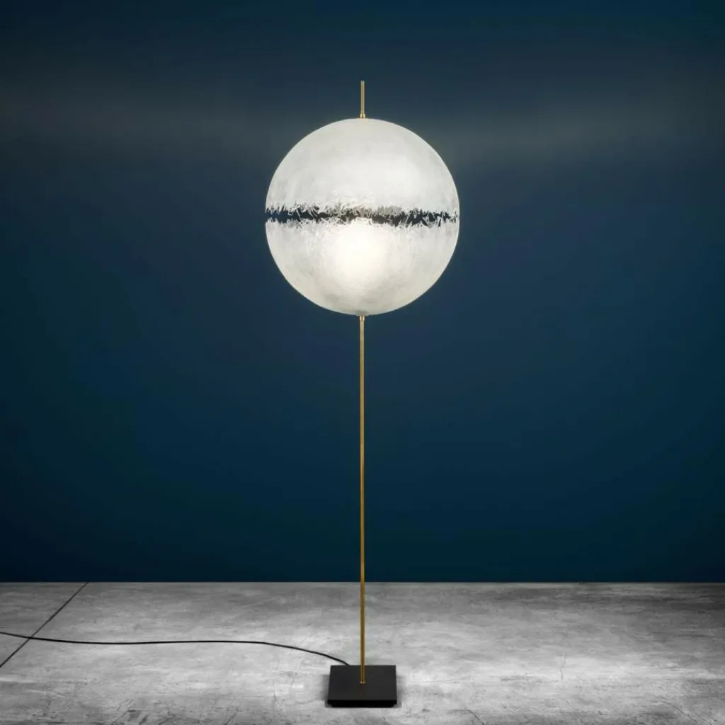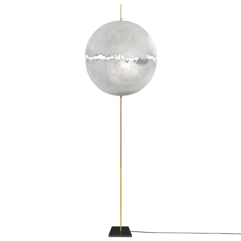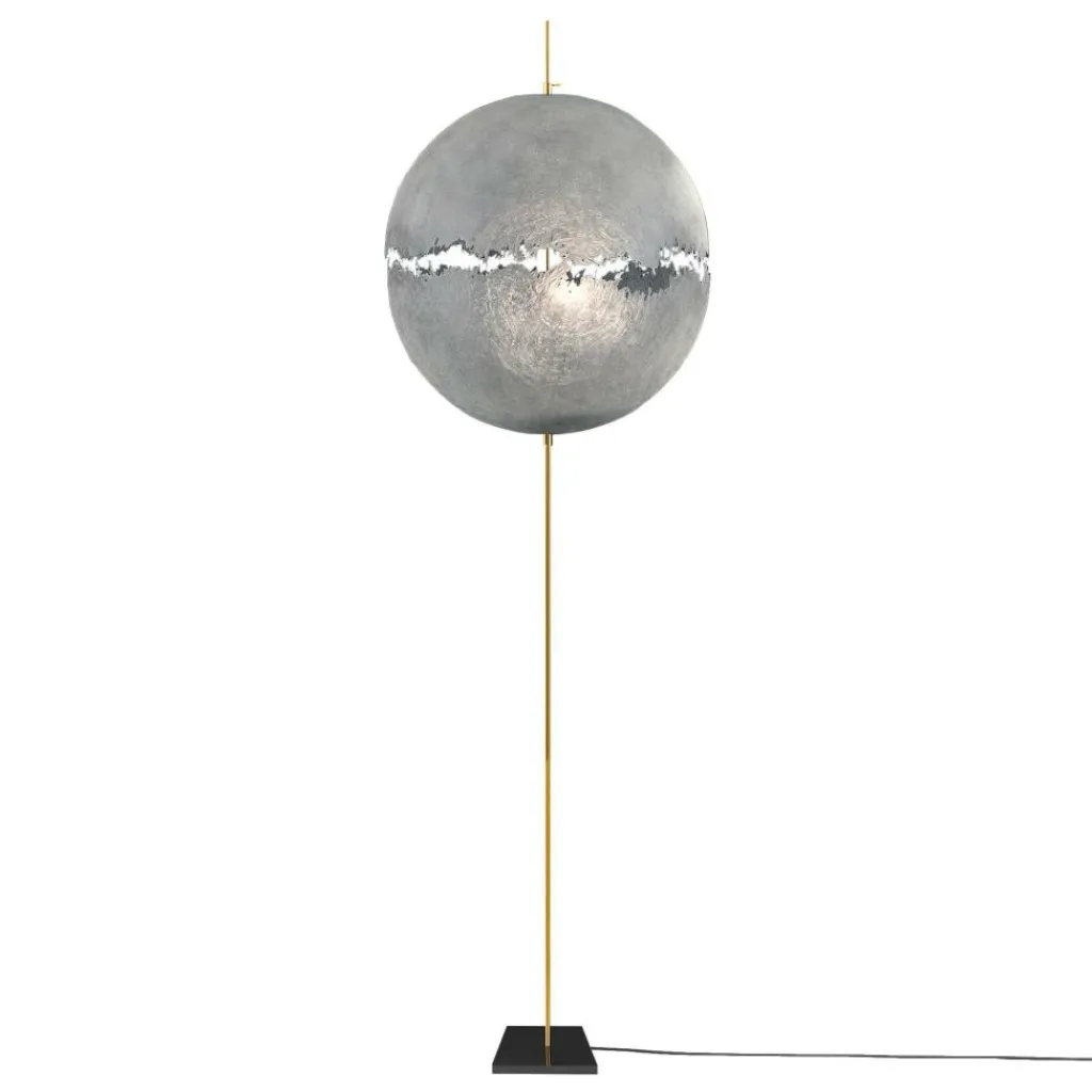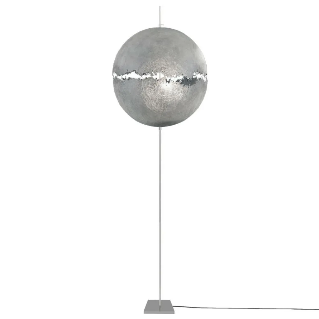 Zu einem wirkungsvollen Blickfang für das designbewusste Ambiente wird die Postkrisi 0064 Stehleuchte durch ihren reizvollen Leuchtenschirm. Gefertigt aus edlem Fiberglas offenbart der Schirm eine unterbrochene Struktur mit unregelmäßigen Rändern. Zwischen den zerfransten Rändern der beiden Halbkugeln entsteht eine Öffnung, die beim eingeschalteten Zustand der Leuchte einzigartige Lichtreflexe zaubert und die Wände mit wirkungsvollen Projektionen schmückt.