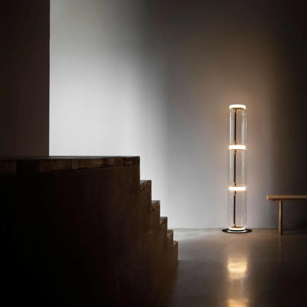 Die Stehleuchte der Noctambule-Leuchtenserie besteht aus einzelnen zylinderförmigen Elementen, die aus mundgeblasenem Glas gefertigt wurden. Diese geometrische und gleichzeitig luftige Optik lässt die Noctambule Low Cylinders Small Base LED Stehleuchte am Tage wie ein Dekorationsobjekt erscheinen, im Dunklen zieht sie hingegen alle Blicke auf sich. Zwischen den Glaskörpern befinden sich die LED-Einheiten, die in einem warmen Weißton den Raum erhellen. Praktischerweise können diese gedimmt werden und je nachdem, welche Lichtintensität Sie bevorzugen, eingestellt werden. Egal ob Sie die Stehleuchte im Wohnzimmer, im Schlafzimmer, im Bad oder im Flur aufstellen – durch ihre außergewöhnliche, geometrische Form wird sie in jedem Raum zu einem Blickfang.
