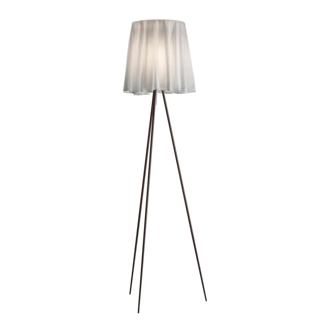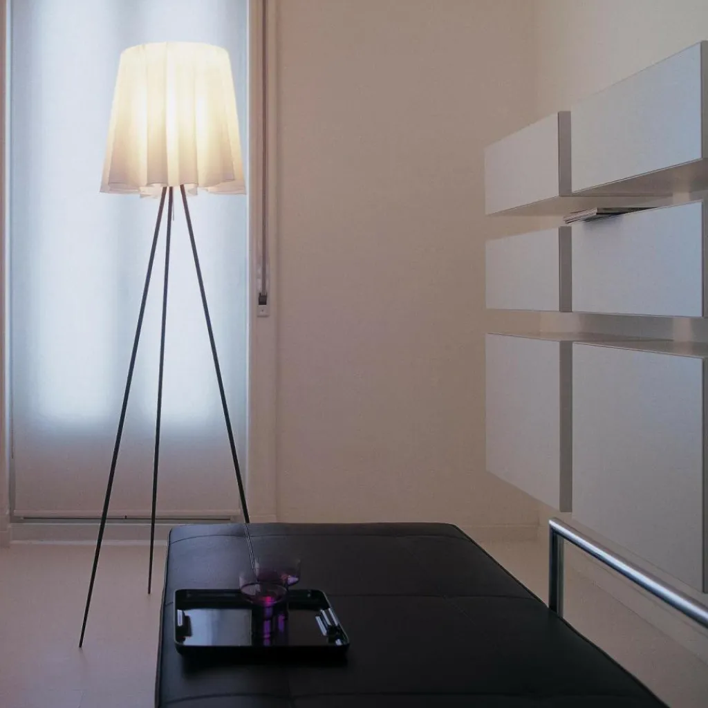 Die Rosy Angelis Stehleuchte steht auf einem filigranen, dreibeinigen Gestell. Dafür verwendet der Designer Aluminium. Der Diffusor besteht aus dem luftig-leichten Spezialgewebe Polyamid, das in Falten gelegt ist. Darunter verbirgt sich ein Leuchtkörper, der aus Polycarbonat besteht. Die Rosy Angelis Stehleuchte stammt aus dem Jahr 1994. Sie strahlt diffuses Licht durch den durchlässigen Stoff aus. Das warme Licht verbreitet in jedem Raum behagliche Atmosphäre. Die Rosy Angelis Stehleuchte bringt gute Stimmung in den Wohnraum, eignet sich jedoch auch für elegante Restaurants und mondäne Ballsäle. Der Schalter befindet sich unterhalb des Leuchtenschirms. Es handelt sich um einen schlanken Aluminiumstab. Damit kann man die Helligkeit von 0 bis 100 Prozent durch eine Drehbewegung einstellen.