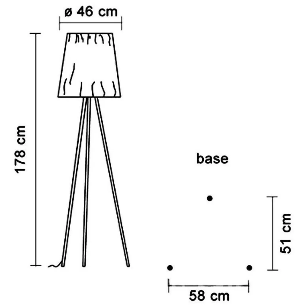 Die Rosy Angelis Stehleuchte braucht ein Leuchtmittel mit E27-Fassung. Das Modell ist 58 cm breit. Die Höhe beträgt 178 cm. Der Leuchtenschirm ist 45 cm hoch und hat einen Durchmesser von 46 cm. Die Leuchte ist 1,6 kg schwer. Die Kabellänge beträgt 250 cm.