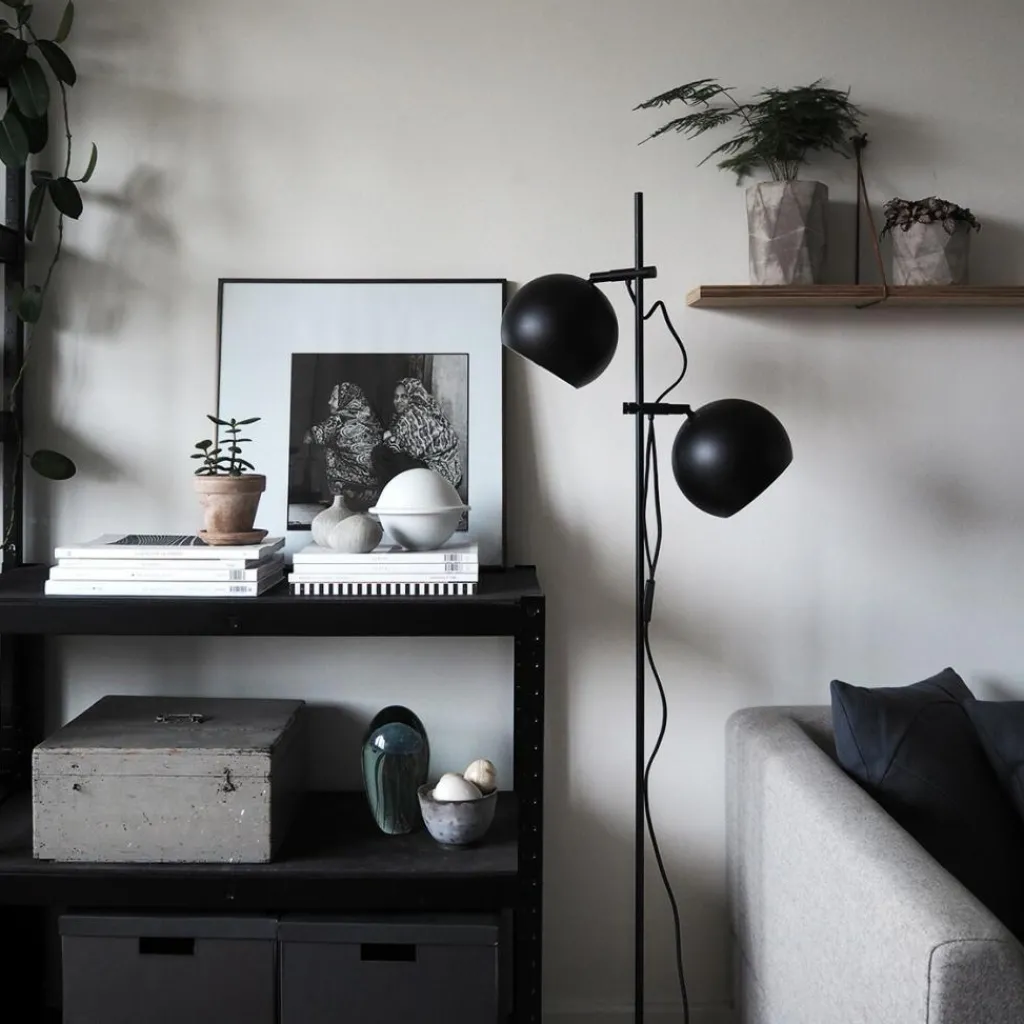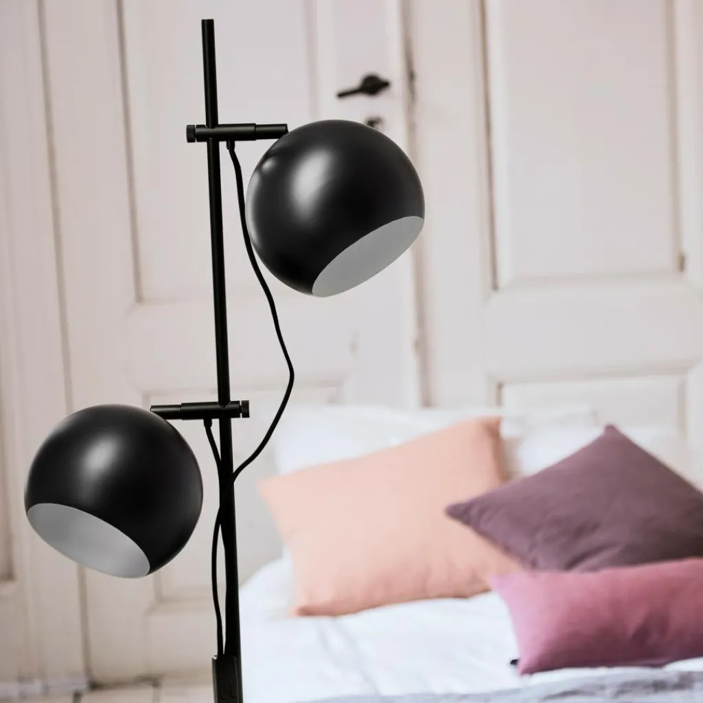 Die Ball Double Stehleuchte wurde von Benny Frandsen für Frandsen entworfen. Das im Jahr 1968 im dänischen Horsens gegründete Designstudio entwirft und produziert nachhaltige und hochwertige Leuchten. Die Bewahrung der ästhetischen Wohn- und Einrichtungskultur Skandinaviens liegt dem Gründer dabei besonders am Herzen. Die von ihm entwickelte Ball-Leuchtenserie hat in seiner Heimat beinahe schon Kultstatus erreicht. Die Ball Double Stehleuchte ist Teil einer Kollektion von weiteren stilvollen Leuchten und in einem matten Schwarz erhältlich. Die aus Metall hergestellte Leuchte verfügt über zwei bewegliche und in unterschiedlicher Höhe angebrachten Leuchtenköpfe. Dadurch kann die gewünschte Richtung der Abstrahlung des blendfreien Lichtes eingestellt werden. Die Leuchte hat die Abmessungen von 24cm in der Breite, 149cm in der Höhe, 45cm in der Tiefe, und der Durchmesser jedes einzelnen Schirms beträgt 18cm. Das Kabel der 5,7kg wiegenden Ball Double Stehleuchte hat eine Länge von 280cm, ist mit schwarzem Textil umhüllt und mit einem Ein- und Ausschalter am oberen Ende versehen. Zwei Leuchtmittel für die Fassung E27 können unter Zubehör gleich mitbestellt werden. Die Leuchte lässt sich mit einem feuchten Tuch einfach reinigen und ist neben dem Sofa oder dem Bett ein formschöner Lichtspender.