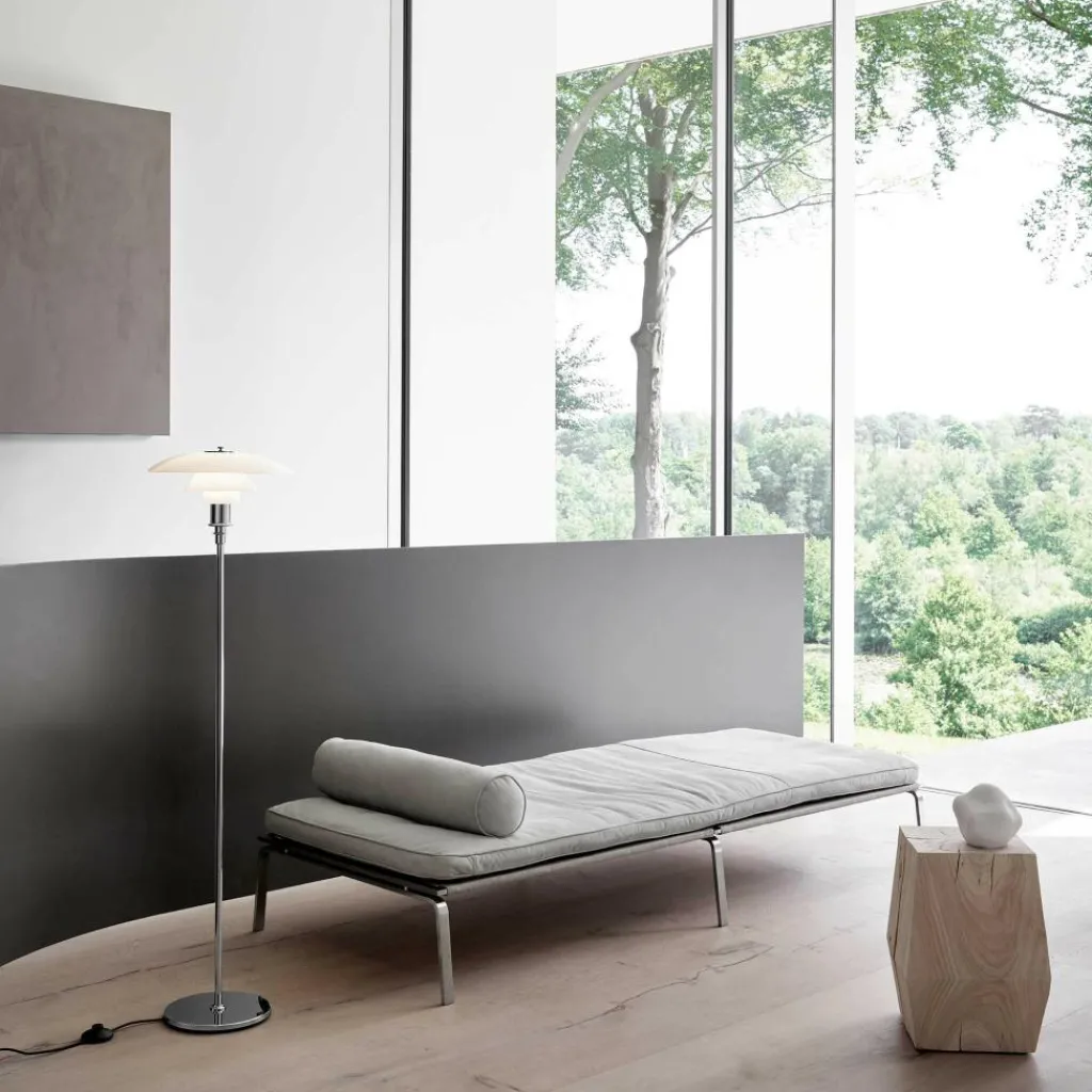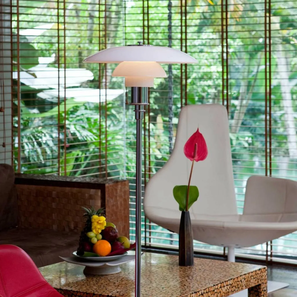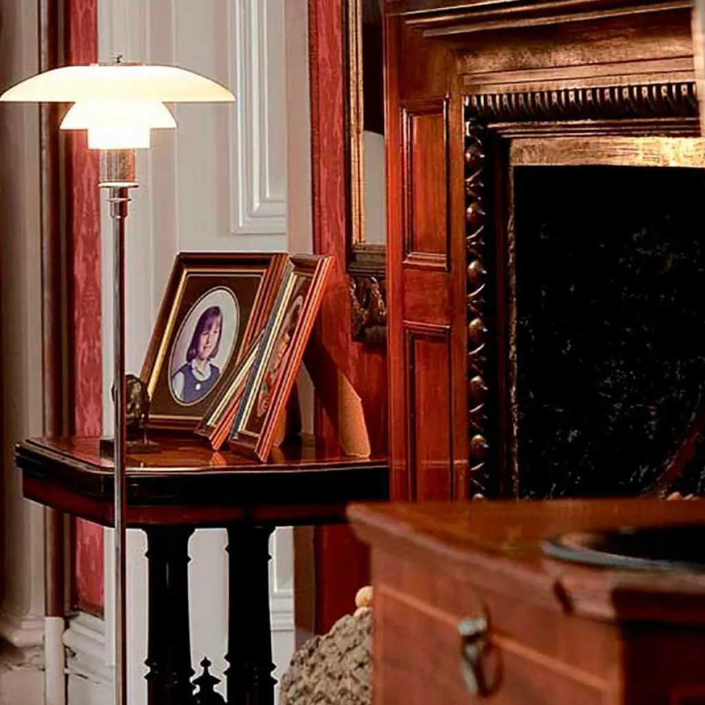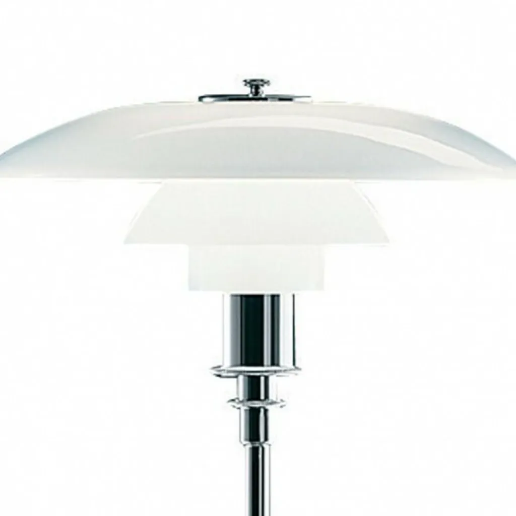 Die PH 3½-2½ Stehleuchte spendet ein weiches Licht. Es wird, wie bei allen Leuchten der PH 3/2-Familie, von mehreren Schirmen reflektiert und blendfrei in den Raum abgestrahlt. Die Form der Schirme baut auf einer logarithmischen Spirale auf, in deren Brennpunkt das Leuchtmittel platziert ist. Opalglas, weiß. Hochglanzverchromt. Schirme: mundgeblasenes Opalglas, weiß. Leuchtenfuß: gezogenes Messing, hochglanzverchromt. Abschlussplatte: gezogenes Messing, hochglanzverchromt. Standrohr: gezogener Stahl, hochglanzverchromt.