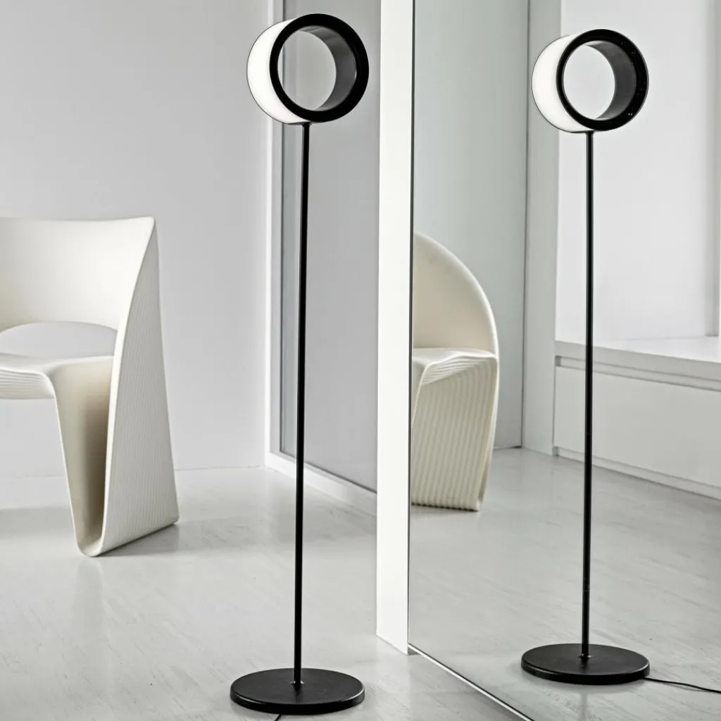 Ein ringförmiger Leuchtenkopf über einem schlanken Stahlrohr und einer runden Fußscheibe aus Aluminiumdruckguss: Damit ist die Lost LED Stehleuchte auch ausgeschaltet ein Hingucker. Ein einfaches Antippen der inneren Ringwand lässt sie erleuchten. Eine längere Berührung dimmt sie bis zur gewünschten Helligkeit. Die Leuchtmittel sitzen auf dem Leuchtenkopf aus lackiertem ABS und erzeugen ein gleichmäßiges Licht, das dank des Diffusors aus einem hochwertigen PMMA-Kunststoff blendfrei und ohne störende Schatten ist – ein außergewöhnliches Stimmungslicht für eine Lounge, die Lobby eines Designhotels, eine Boutique oder das Wohnzimmer.