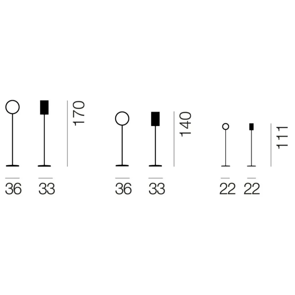 Die Lost-Kollektion umfasst Stehleuchten mit Höhen von 111cm, 140cm oder 170cm. Der Leuchtenring der kleinen Lost LED Stehleuchte hat einen Durchmesser von 17,5cm und eine Tiefe von 10,5cm. Der Durchmesser der größeren Modelle ist 36cm bei einer Tiefe von 21,5cm. Die Leuchtenfüße haben Durchmesser von 22cm oder 33cm. Das Kabel ist jeweils 200cm lang. Die Stehleuchten wiegen 2,6kg, 7,1kg oder 7,3kg.