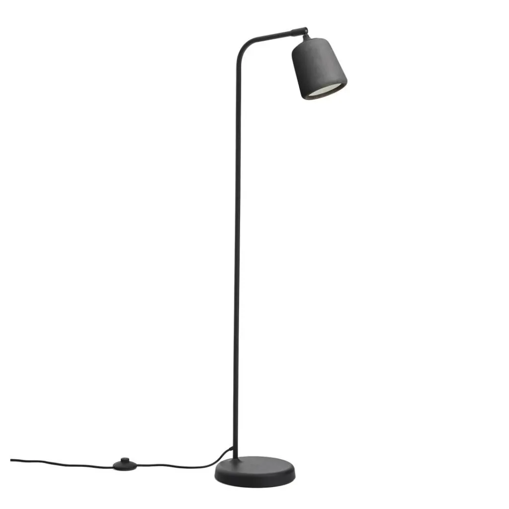 Gestell und Leuchtenkopf sind bei der Material Stehleuchte Beton dunkel gehalten. Doch zeigt der formschöne Leuchtenschirm im Vergleich zum Stiel und der runden Basis einen feinen Kontrast. Er ist aus Beton gefertigt und schenkt der Designleuchte eine robuste Optik, während das schlanke Aluminiumgestell mit seiner pulverbeschichteten Oberfläche eine leichte Optik schafft. Mit seiner weißen Innenfläche erzeugt der Schirm einen gerichteten Lichtkegel, der sich mit dem schwenkbaren Kopf der Material Stehleuchte Beton beliebig ausrichten lässt. Das homogene Licht eignet sich perfekt zum Lesen oder Arbeiten. Damit passt die Material Stehleuchte Beton neben die Couch oder einen Lesesessel und macht sich ebenso gut in den Zimmern eines Designhotels.