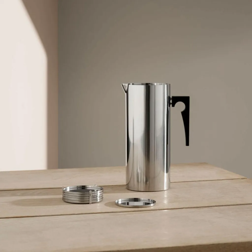 Die Cylinda Line Kanne mit Eislippe wurde ursprünglich von dem weltbekannten dänischen Architekten und Designer Arne Jacobsen in Zusammenarbeit mit dem Hersteller Stelton.