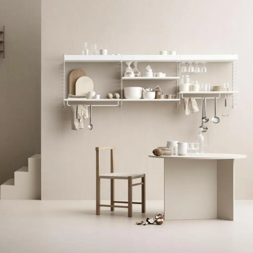 Das formschöne Küchenregal 234x75x30cm des Herstellers String strahlt durch Material und Farbgebung und vor allem durch seinen schlichten Look skandinavischen Charme aus. In den seitlichen Gittern findet sich der bekannte String-Stil wieder. Die dezente Form eignet sich vor allem für Küchen im Retro- und Vintage-Design.