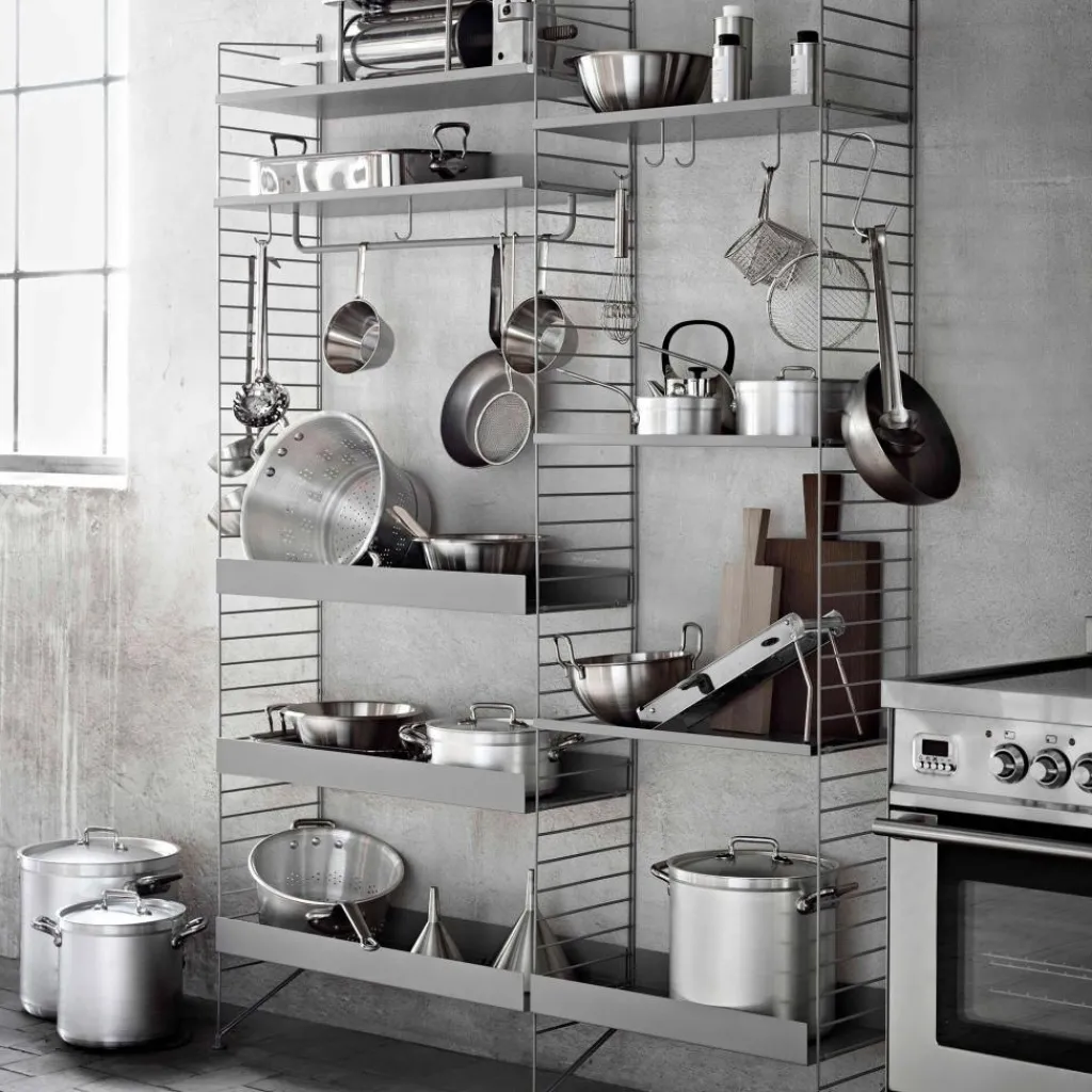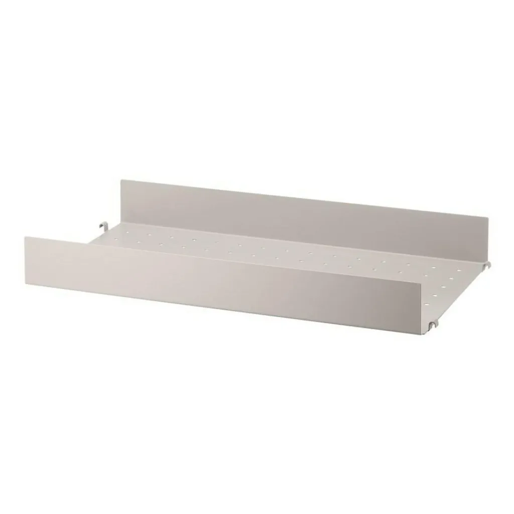 Die 7 cm hohe Kante vorne und hinten ist nicht nur ein gestalterisches Element, sondern auch praktisch im Alltag: Sie verhindert, dass Gegenstände wie Küchenutensilien, Töpfe, Bastelmaterial oder Spielzeug herunterfallen – perfekt für Küche, Kinderzimmer oder Eingangsbereich. Besonders schön sind Kombinationen mit den Metallböden mit einer 2 cm hohen Kante. Hergestellt aus robustem, pulverbeschichtetem Stahl mit feiner Textur, bietet der Boden eine perforierte Oberfläche, die mit vielseitigem Zubehör aus der String Kollektion kompatibel ist – darunter Haken, Stangen oder Halterungen für Gläser und Tassen. Mit einer Tiefe von 30 cm und wahlweise 58 cm oder 78 cm Breite lässt sich der Regalboden flexibel in String Regalleitern mit 30 cm Tiefe einhängen – sowohl in Kombination mit Metallgittern als auch mit Seitenteilen aus Plexiglas. Die Tragfähigkeit liegt bei bis zu 25 kg bei 58 cm Breite beziehungsweise 15 kg bei 78 cm breiten Regalböden, sofern die Last gleichmäßig verteilt ist. Die Reinigung ist unkompliziert: Ein weiches, leicht feuchtes Tuch reicht aus – milde Reinigungsmittel sind erlaubt, auf scharfe oder scheuernde Produkte sollte verzichtet werden. Der Regalboden mit 58 cm Breite wiegt 3 kg, der mit 78 cm Breite 4,1 kg.