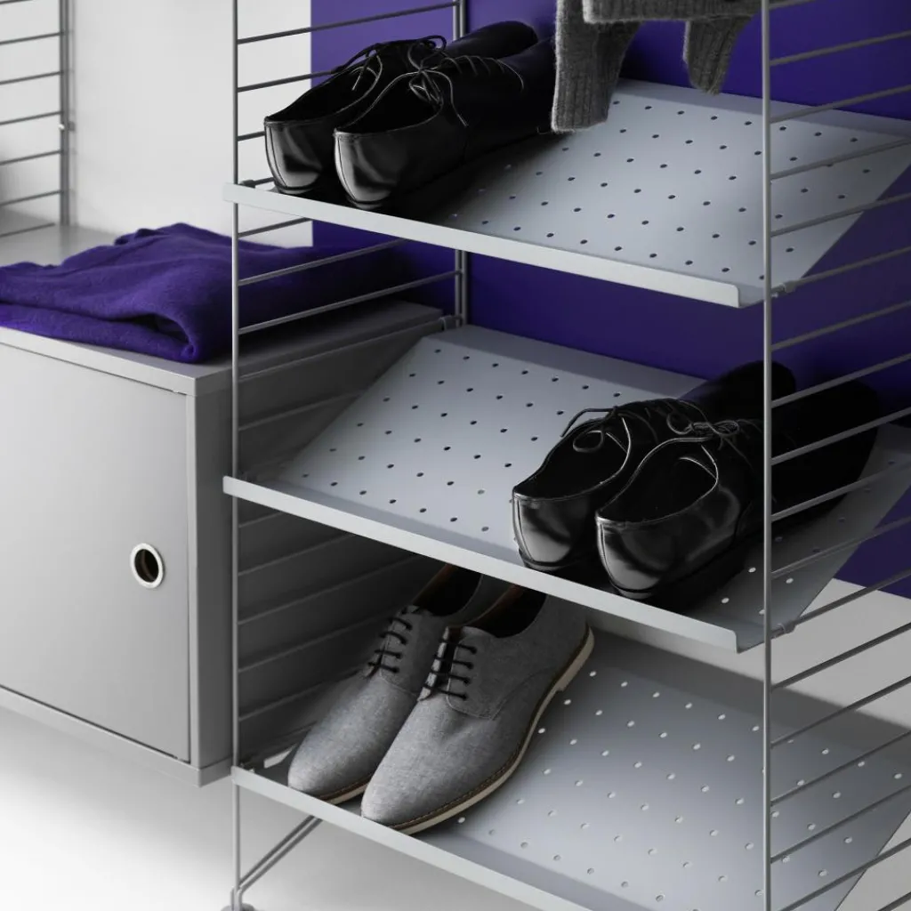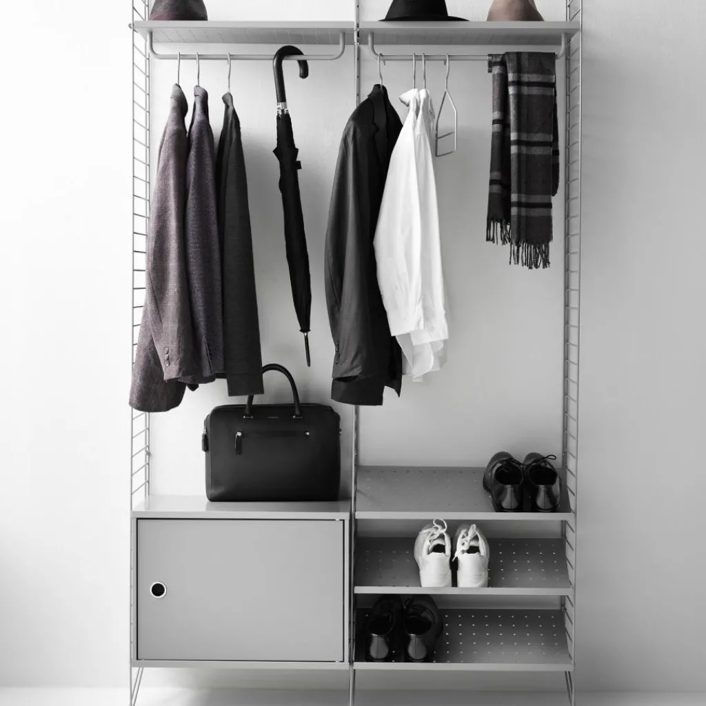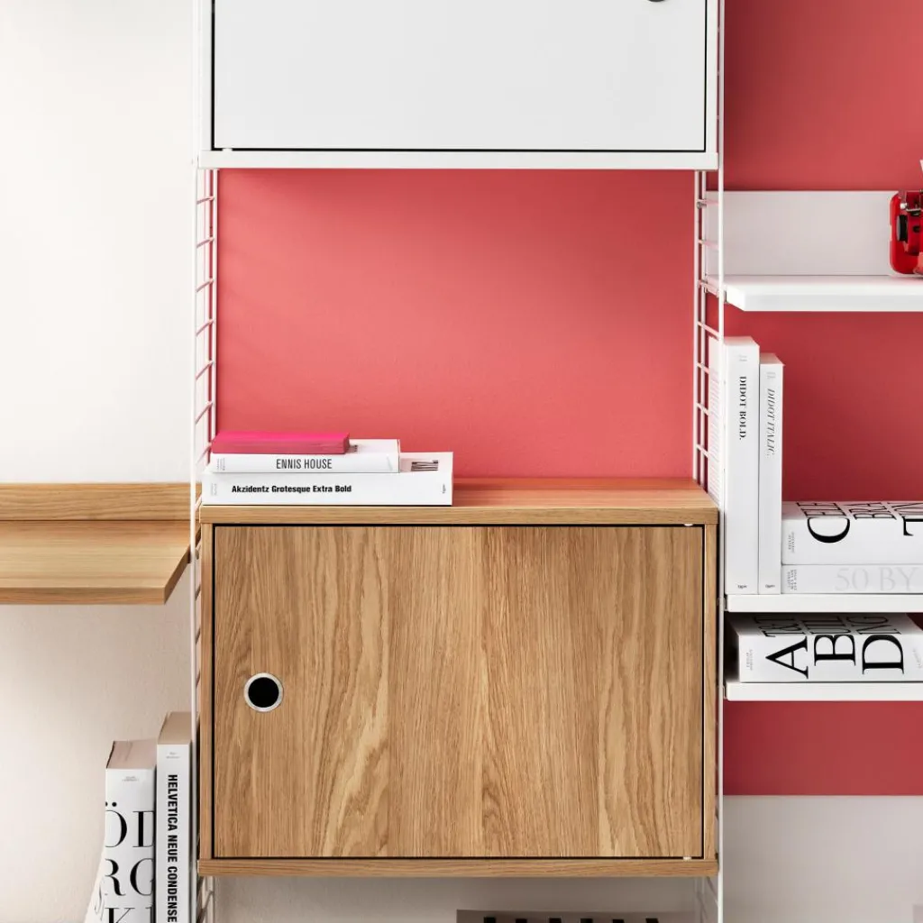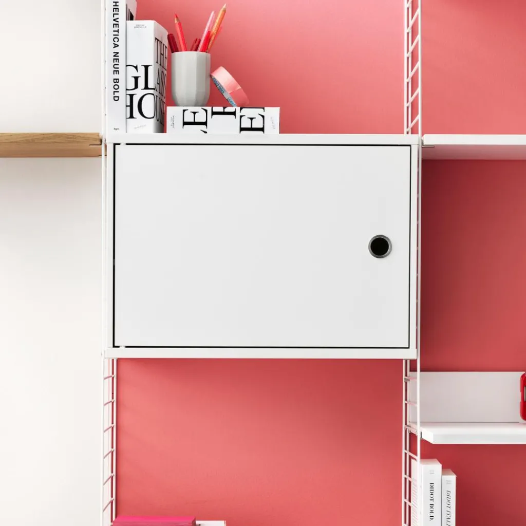 Ursprünglich wird das System aus Stahl gefertigt. Einen interessanten Kontrast zum Rahmen, der zum Teil aus Metallleitern besteht, bildet das String System Schrankelement mit Schwenktür 58x42x30cm. Es besteht nämlich aus Sperrholz oder lackierter MDF in verschiedenen Farben. Hinter der praktischen Schwenktür, die auf beiden Seiten montiert werden kann, verschwinden Bücher und andere Gegenstände. Das String System Schrankelement mit Schwenktür 58x42x30cm ist im Wohn-, Kinder- oder Schlafzimmer ein praktischer und funktioneller Aufbewahrungsort. Es kann jedoch auch im Büro oder Homeoffice verwendet werden.