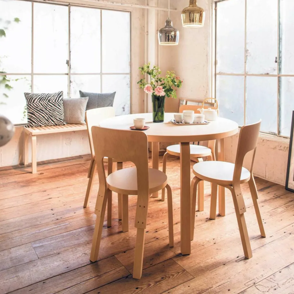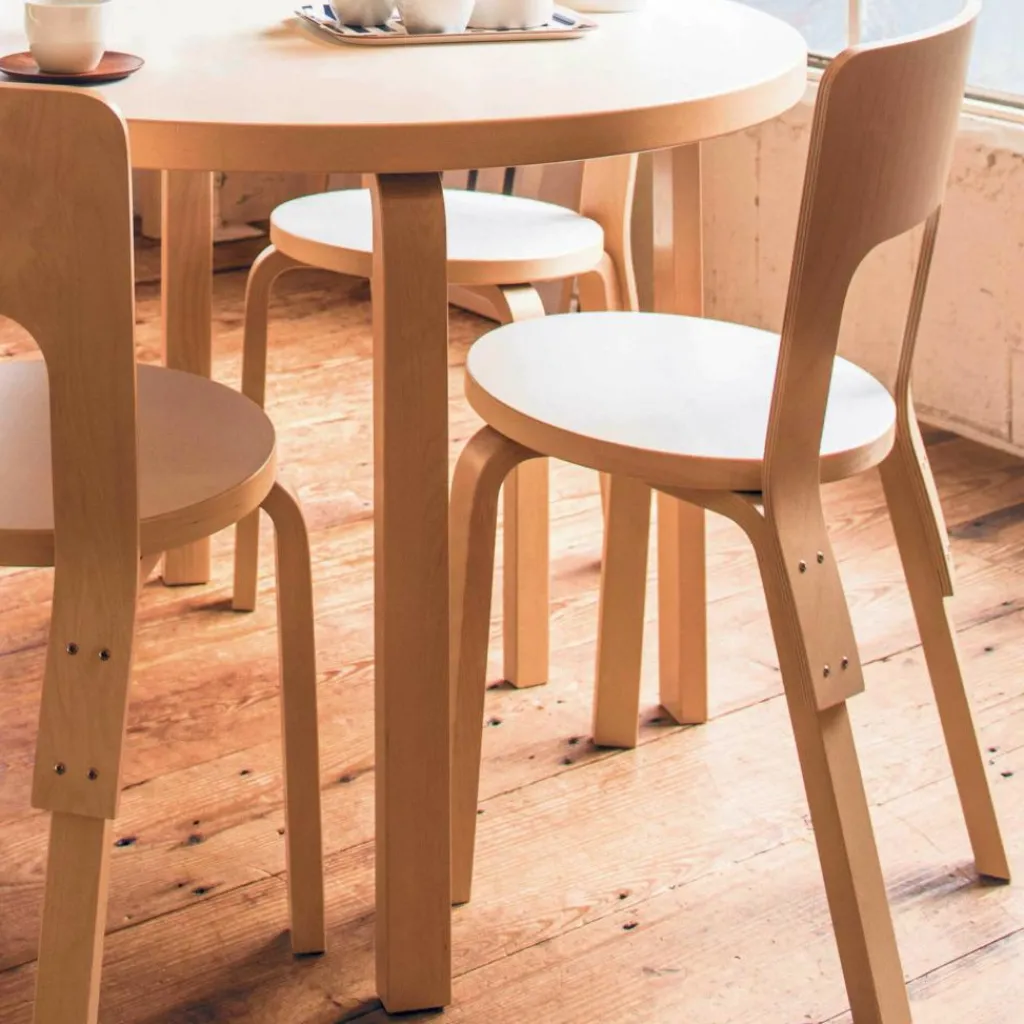 Der 66 Stuhl Gestell klar lackiert wurde von Alvar Aalto für die Marke Artek entworfen. Er gehört zu einer Reihe von zeitlosen Designmöbeln, die in den 1930er-Jahren designt wurden. Der Entwurf der 66-Stuhl-Reihe ist von klassischen Küchen- oder Café-Möbeln inspiriert.