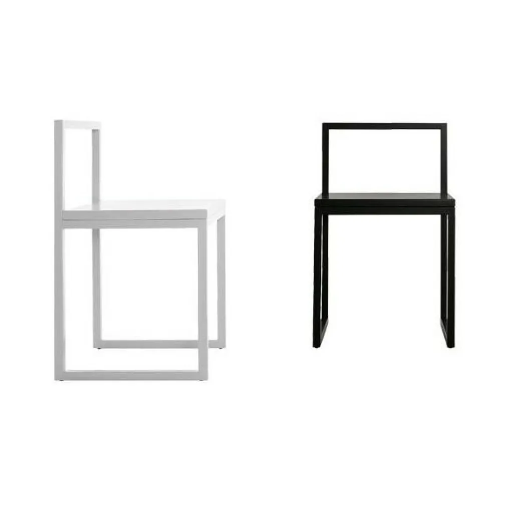 Wie der Name schon vermuten lässt, entstand der Fronzoni ’64 Stuhl im Jahr 1964. Wie von Fronzoni gewohnt, kommt die Sitzgelegenheit ohne unnötige Elemente aus. Das Modell beschränkt sich auf rechteckige Formen, die sich im Gestell, in der Rückenlehne und in der Sitzfläche wiederfinden. Man kann den Fronzoni ’64 Stuhl in verschiedenen Farben bestellen. Für den Rahmen verwendet der Designer matt lackiertes Metall. Die Rückenlehne ist aus demselben Material gemacht. Die vier Füße aus quadratischem Metallrohr vereinigen sich am Boden zu zwei Kufen. An der Unterseite sind Gleiter aus Kunststoff montiert. So werden heikle Böden geschont. Die Sitzfläche des Fronzoni ’64 Stuhls wird aus Holz gemacht. Die Oberfläche ist lackiert.